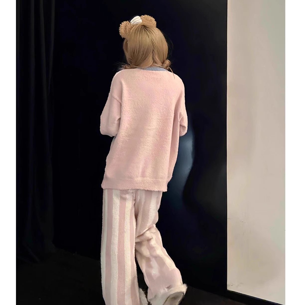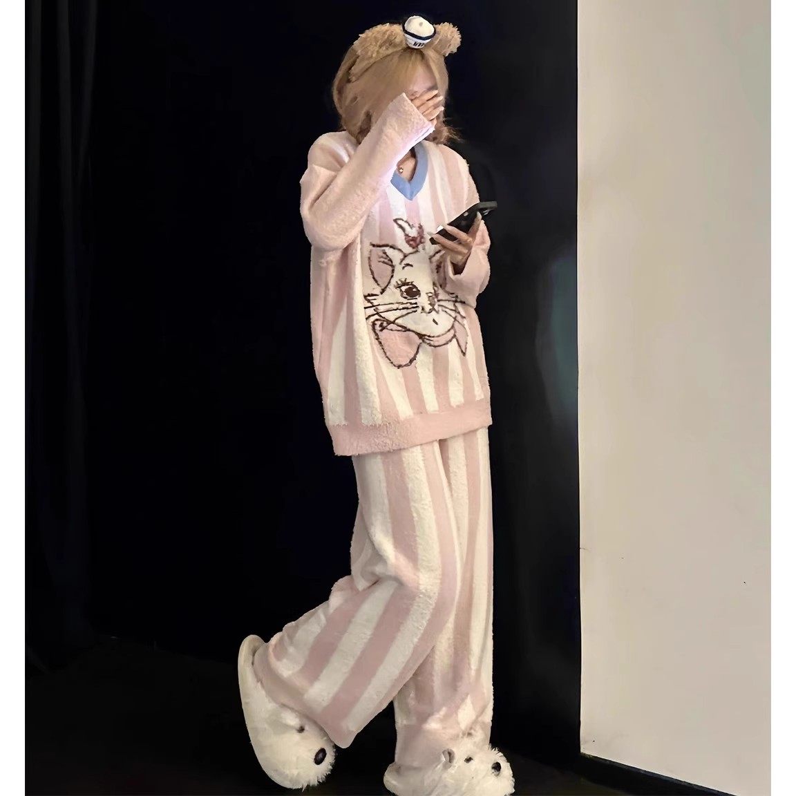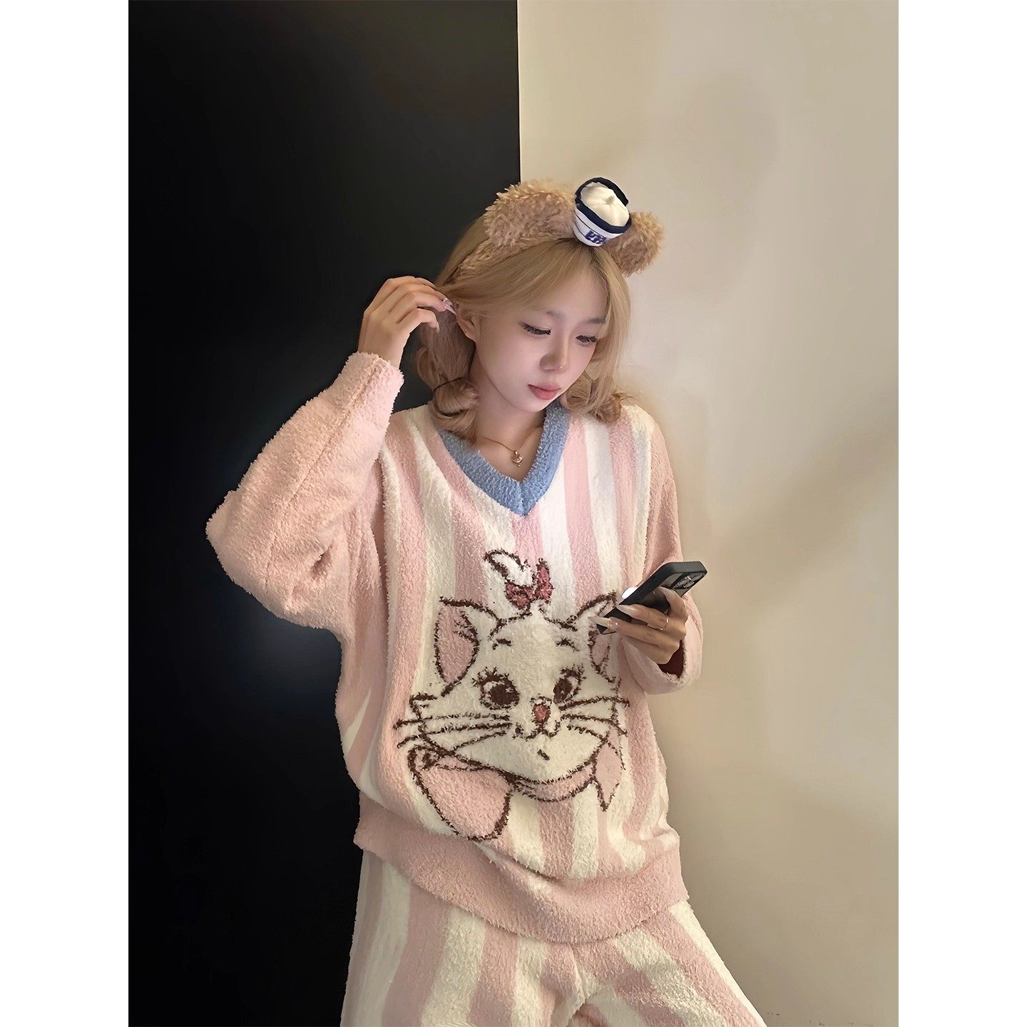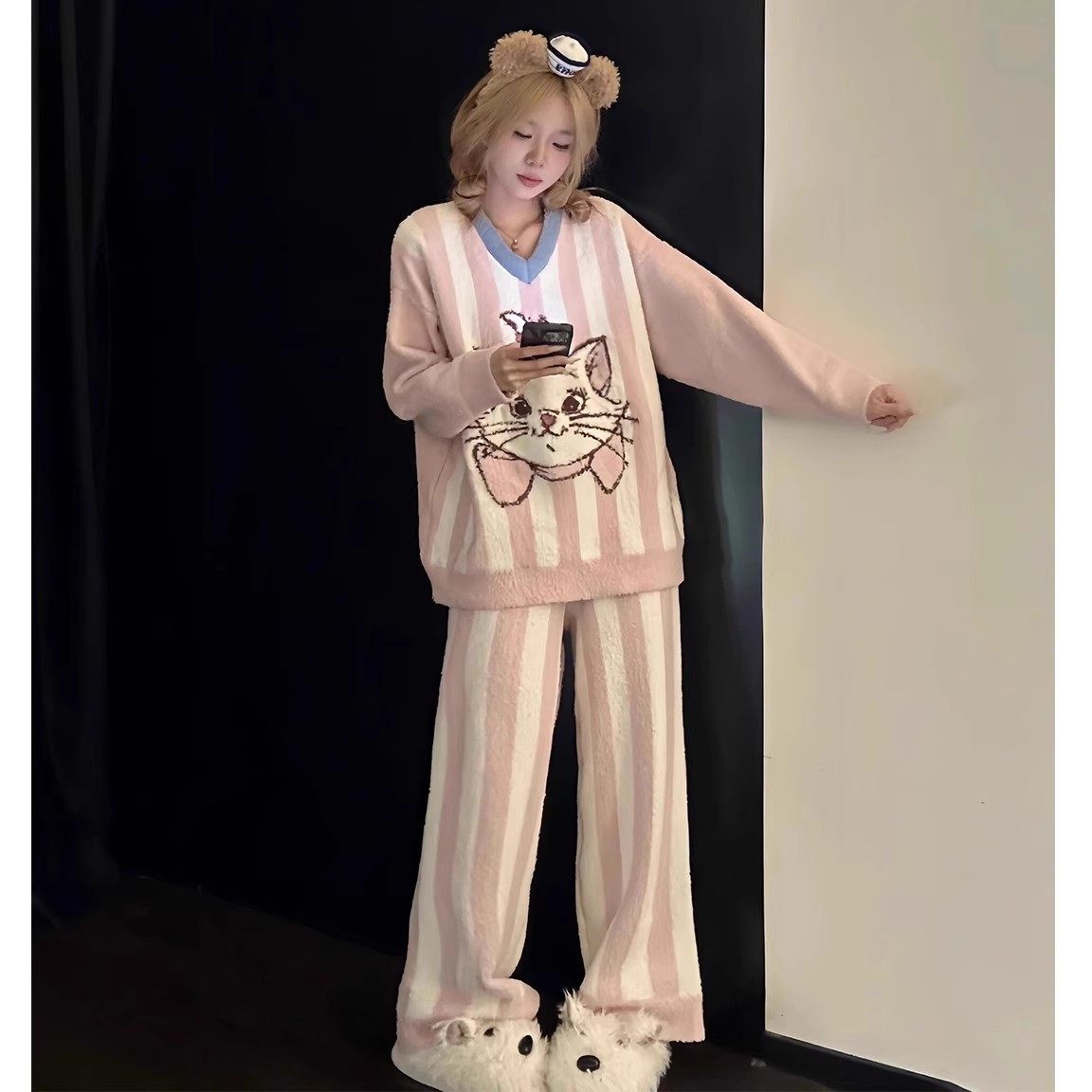 2025新款半边绒保暖睡衣女秋冬可爱卡通软萌猫咪家居服冬套装外穿