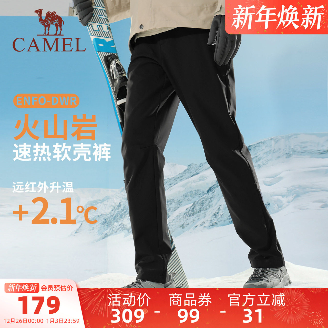 【火山岩发热】骆驼男装冲锋软壳裤摇粒绒防泼水保暖长裤子男黑色