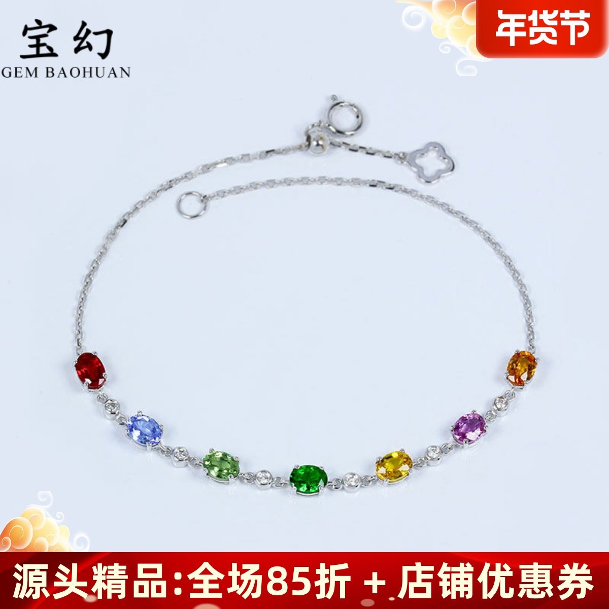 18K白金天然渐变多彩蓝宝石手链 明艳彩虹色镶钻石黄金可调节女款