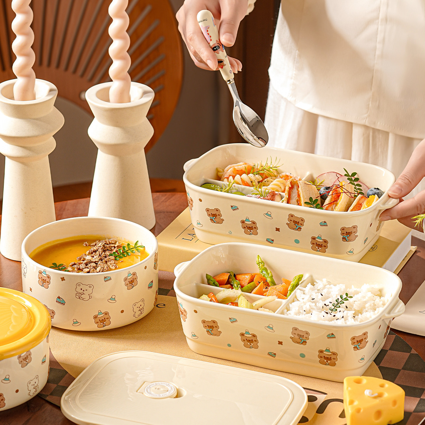 微波炉加热专用饭盒陶瓷分格分隔保鲜盒长方形带饭餐盒餐碗便当盒