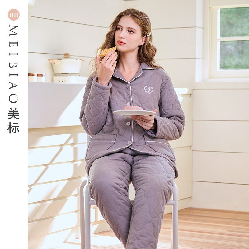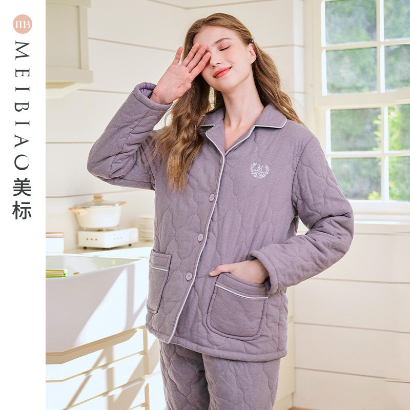 美标三层加厚保暖夹棉纯棉睡衣套装女秋冬季全棉休闲可外穿家居服