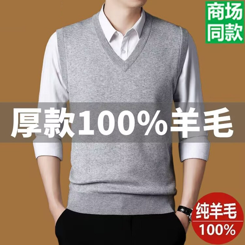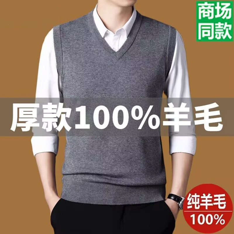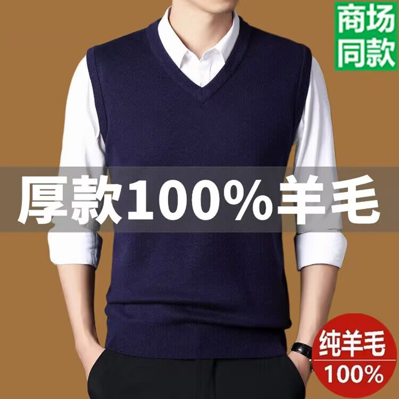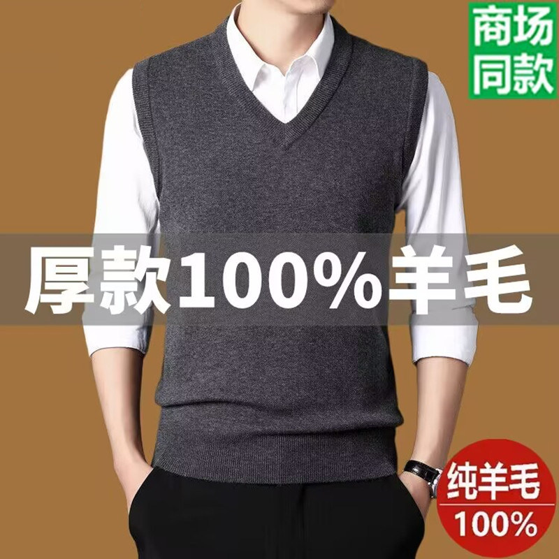 牧王100%羊毛背心男V领加厚毛衣中年宽松坎肩无袖羊绒马甲男装