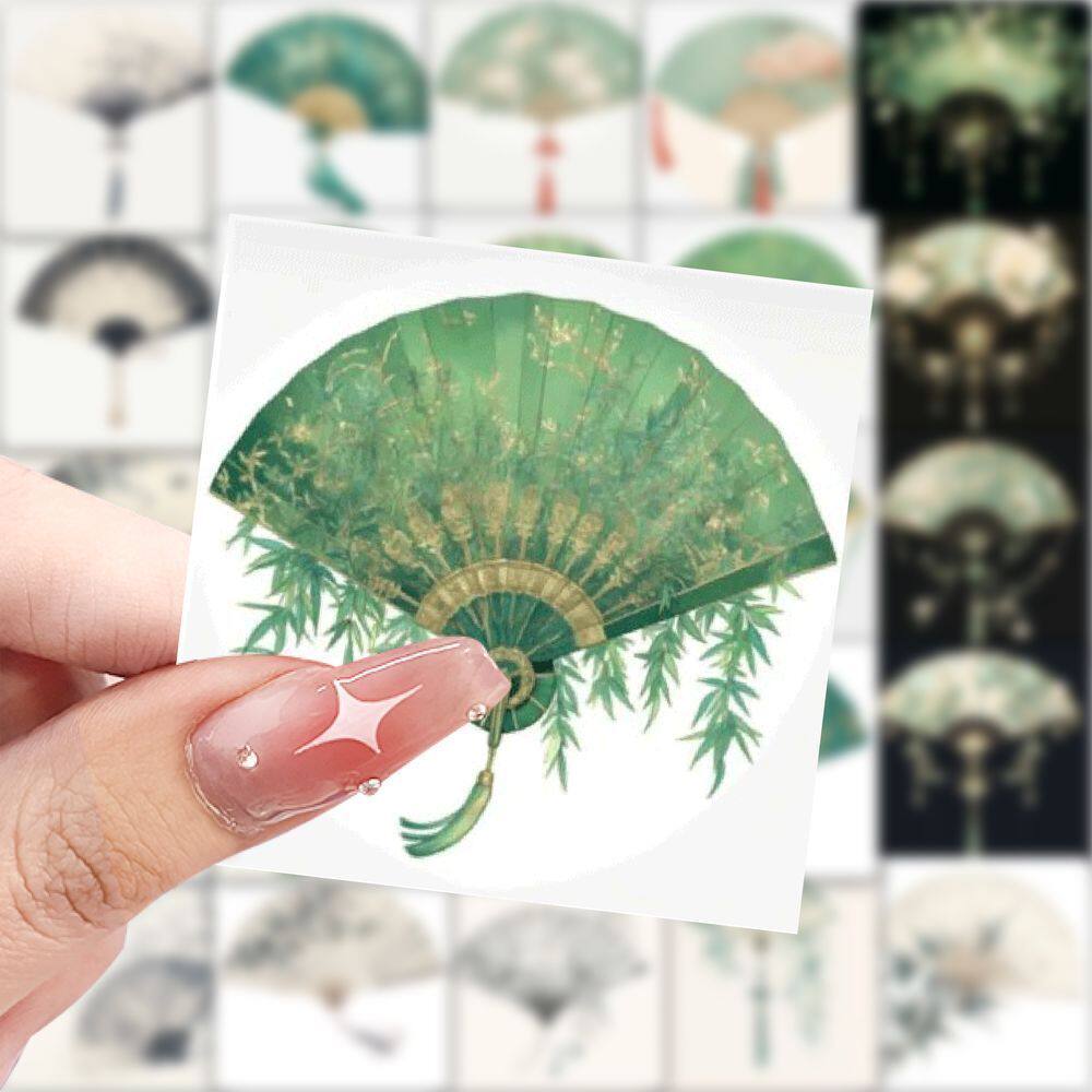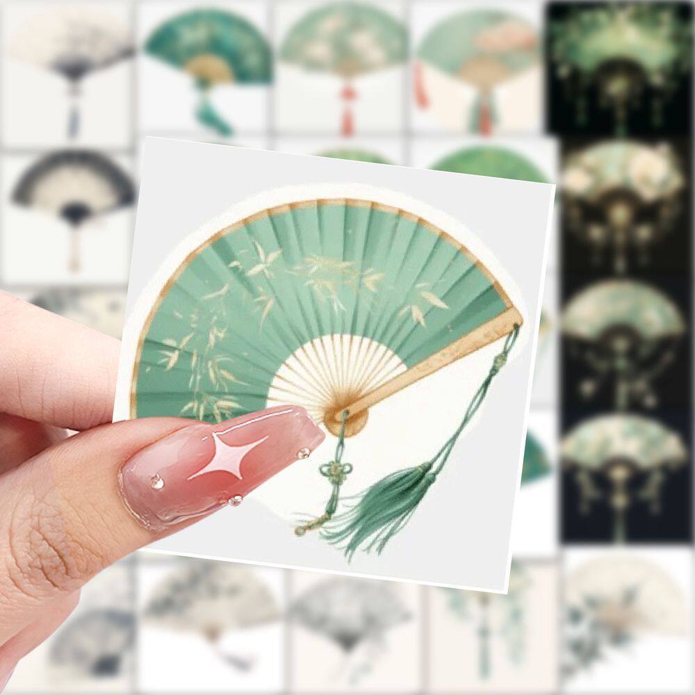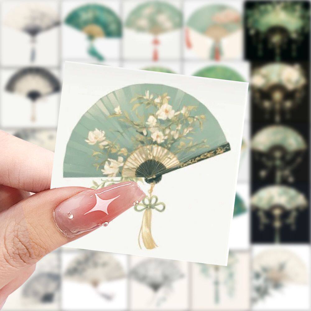 新款古风扇子贴纸唯美创意插画装饰DIY手帐手账水杯素材防水贴画