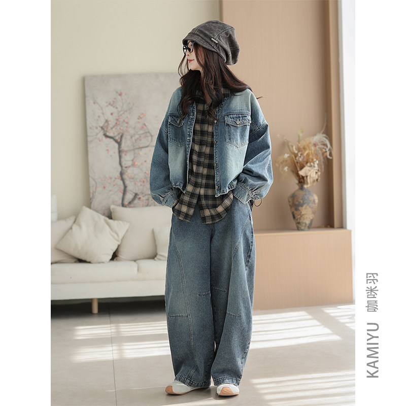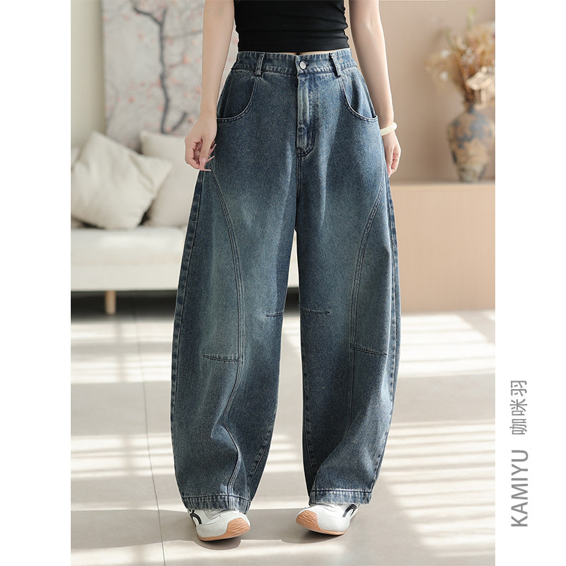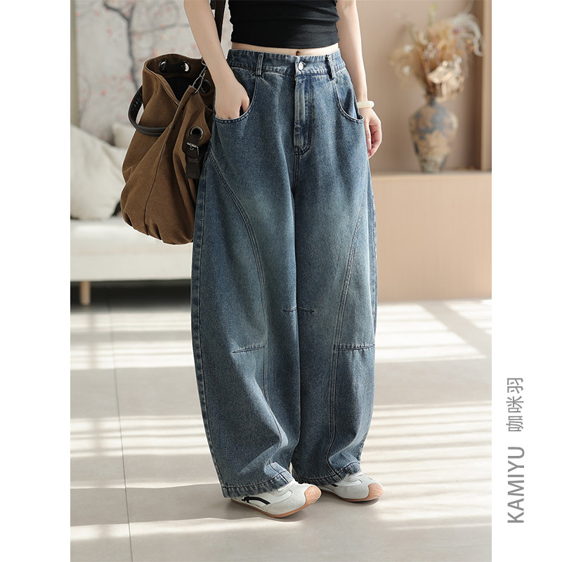 咖咪羽牛仔裤女秋季2025新款时尚宽松拼接百搭复古自然腰女装裤子