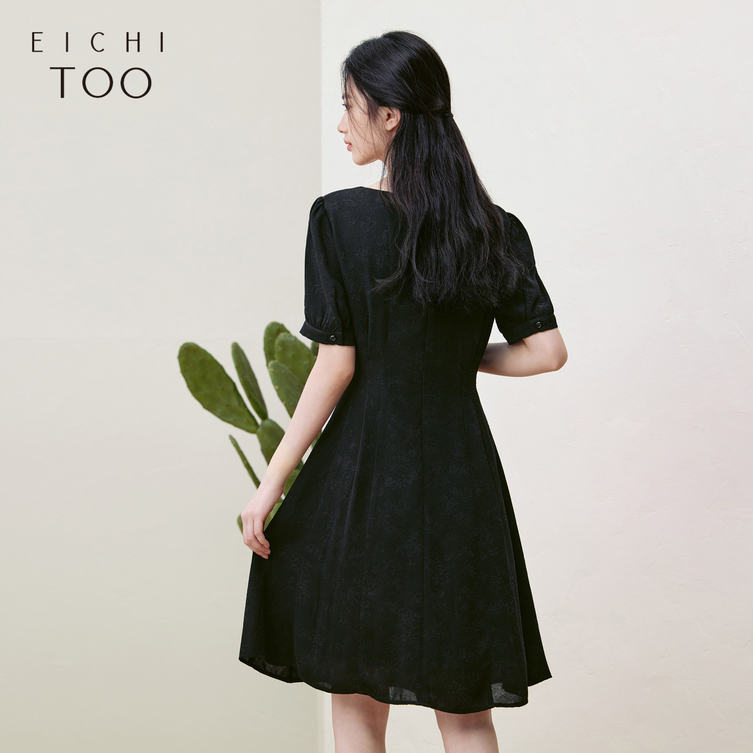 爱居兔雪纺提花经典小黑裙夏季新款显瘦轻薄优雅短袖裙