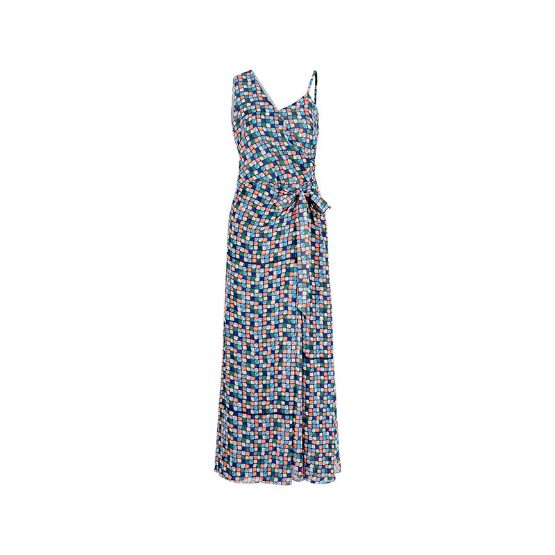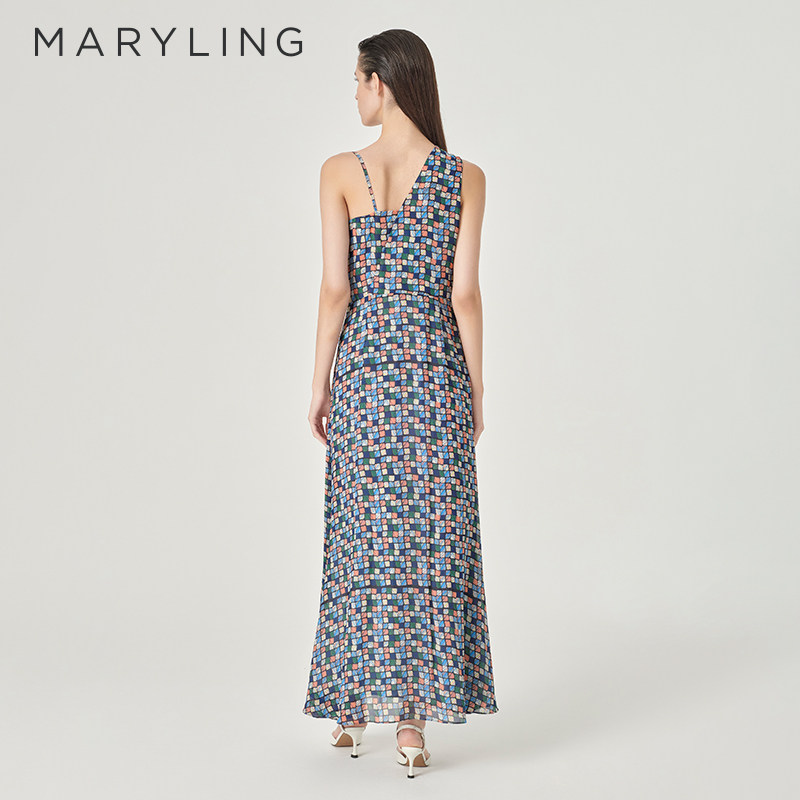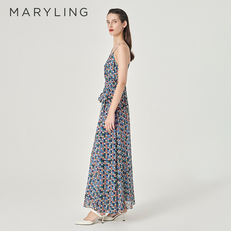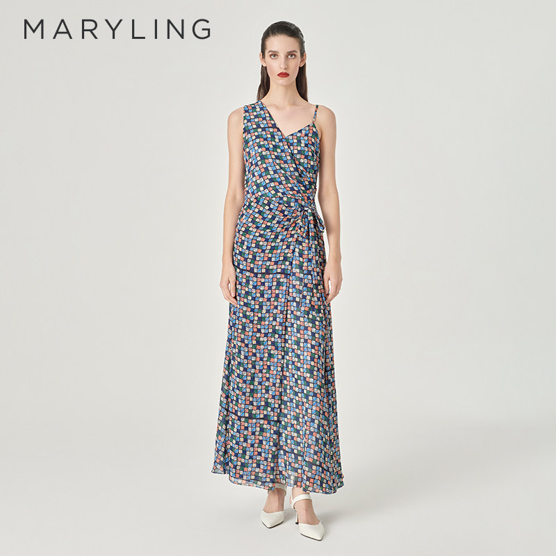 MARYLING玛俪琳24夏新品不对称V领腰系带格纹印花长裙A1ECW64380