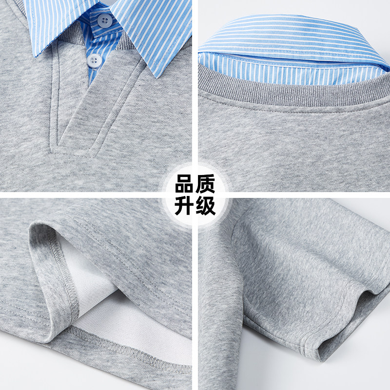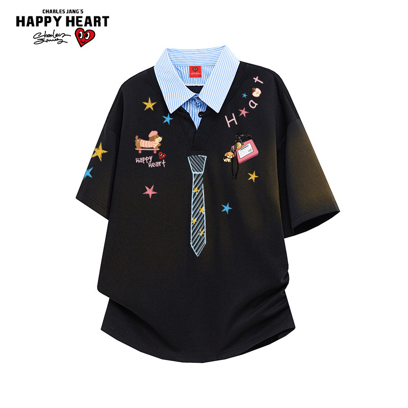 查尔斯桃心涂鸦领带印花衬衫领短袖POLO男夏上新拼接宽松情侣T恤