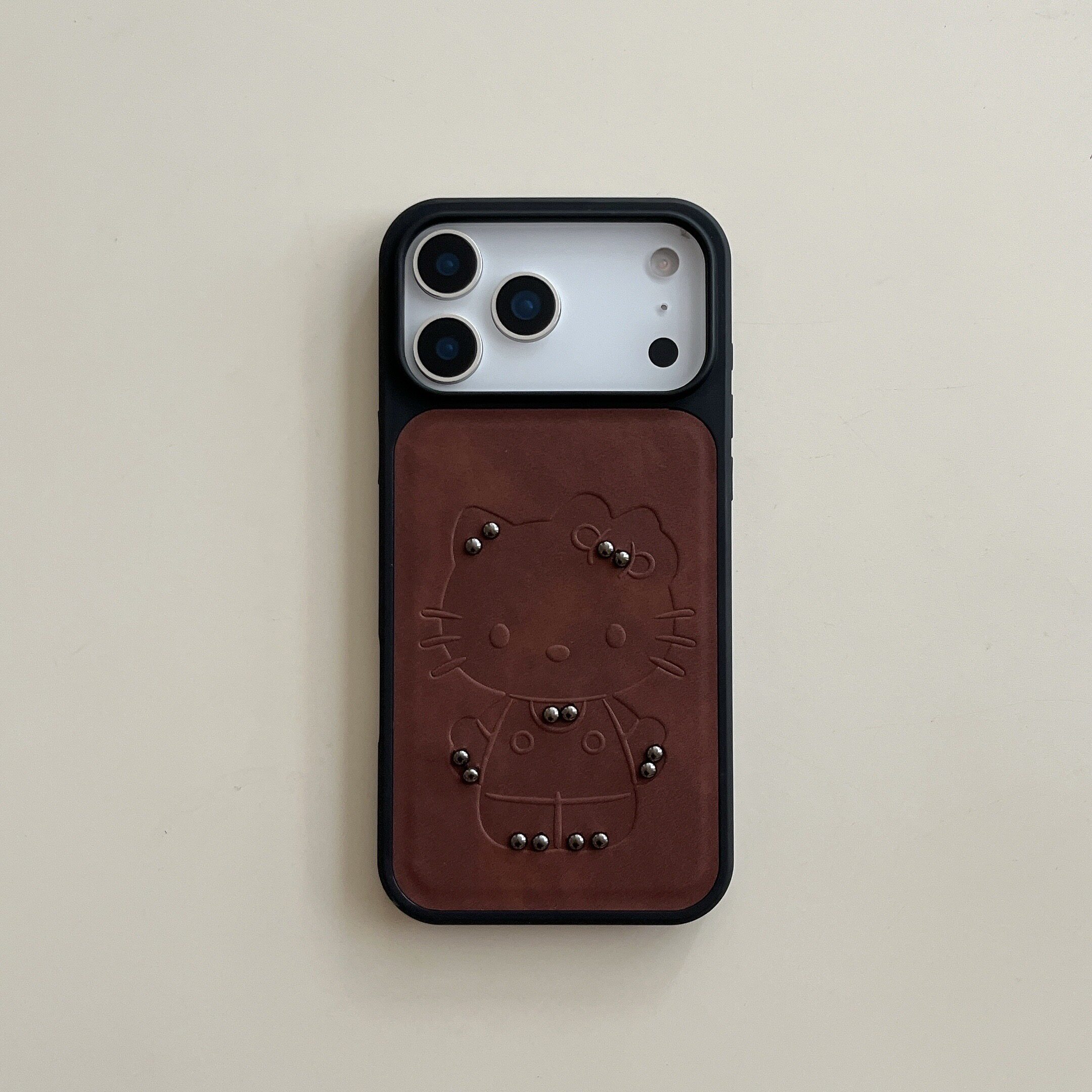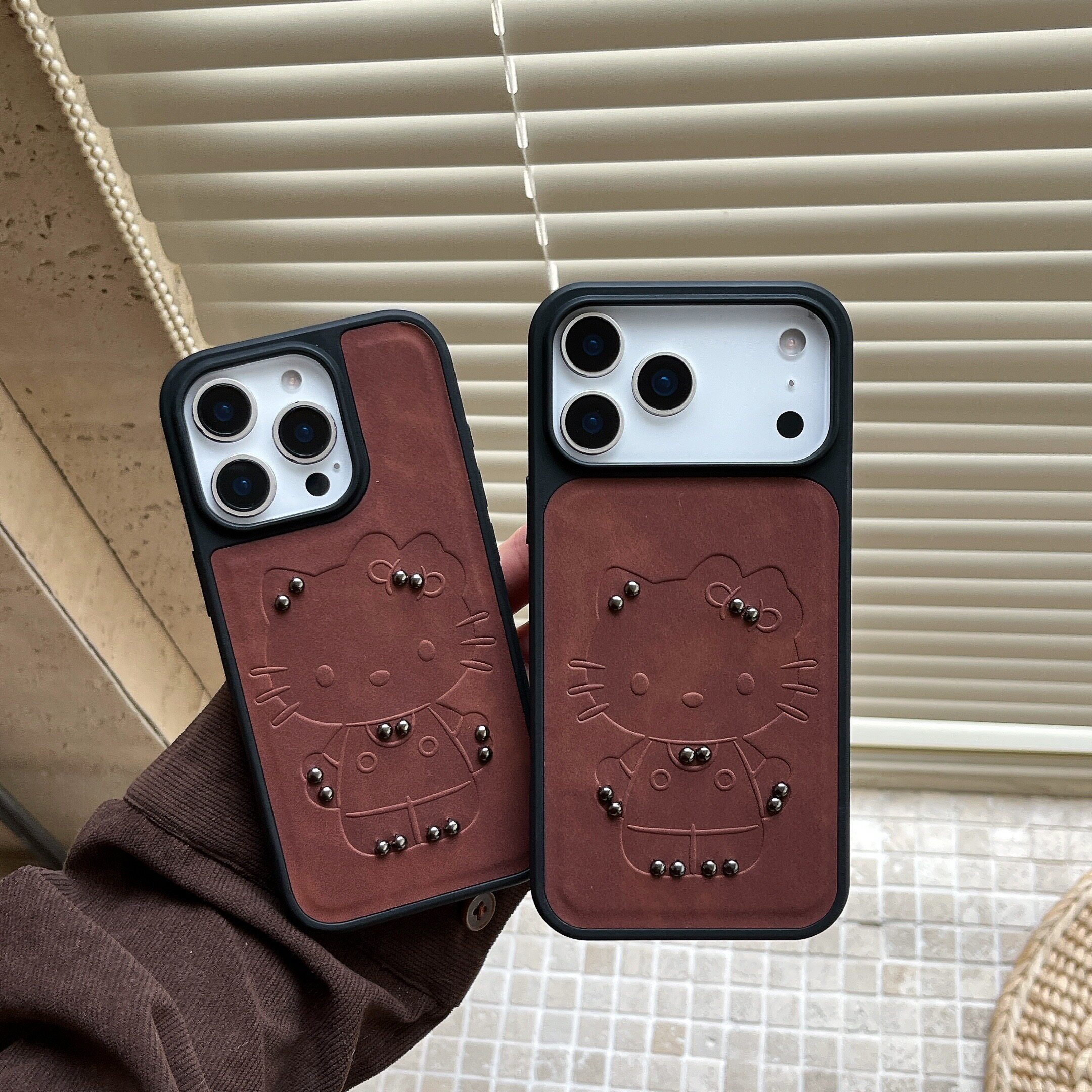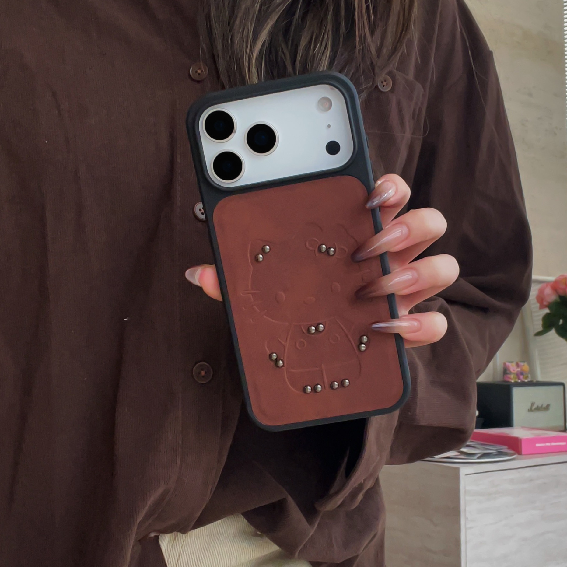 淳于亦ins风棕色小羊皮凯蒂猫适用苹果17promax手机壳15全包按键黑框大视窗14/13卡通少女铆钉装饰16保护防摔