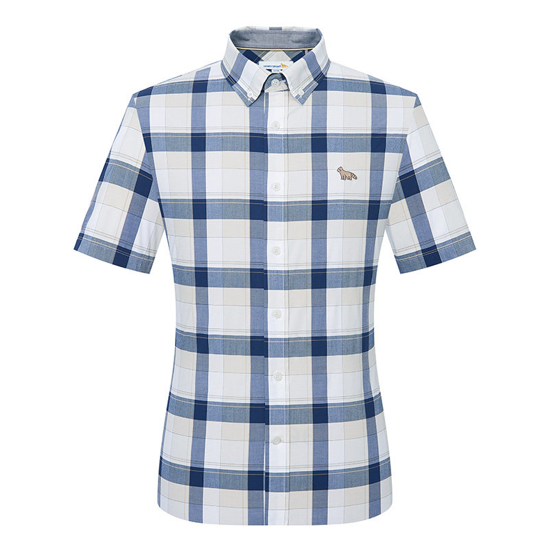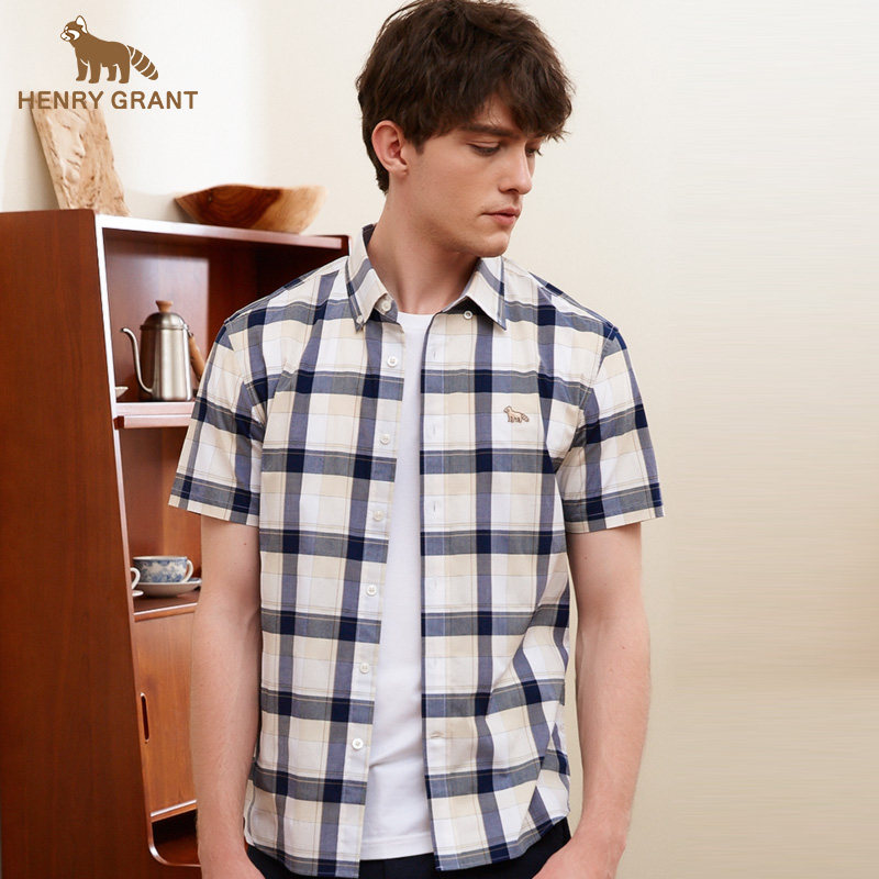 亨利格兰小熊猫男装夏季新品商务休闲男友风复古格纹短袖衬衫外套