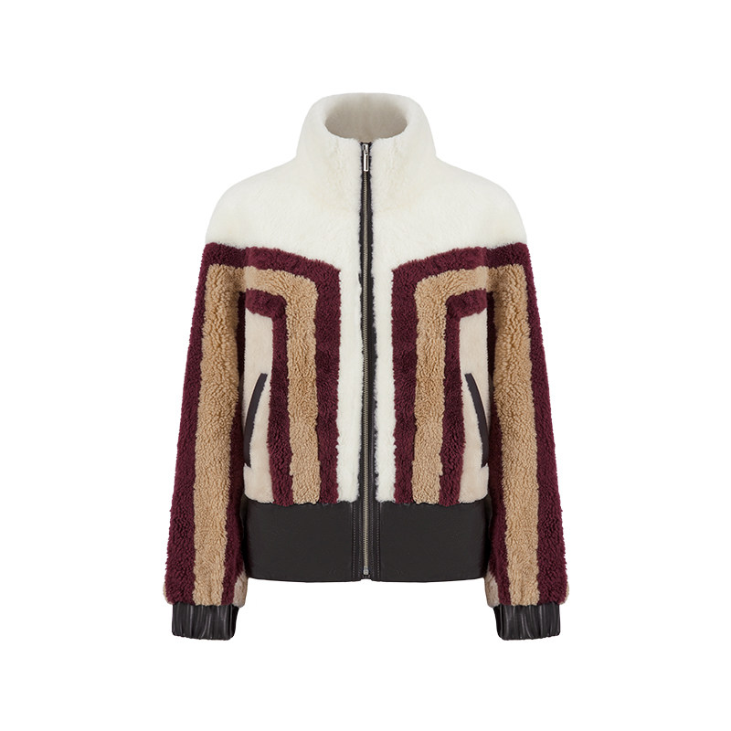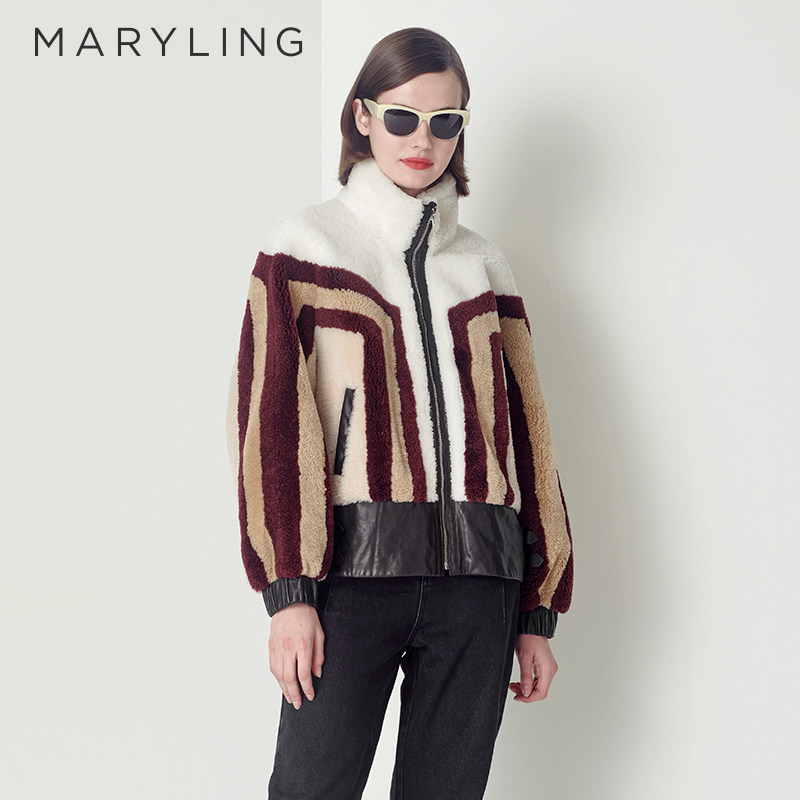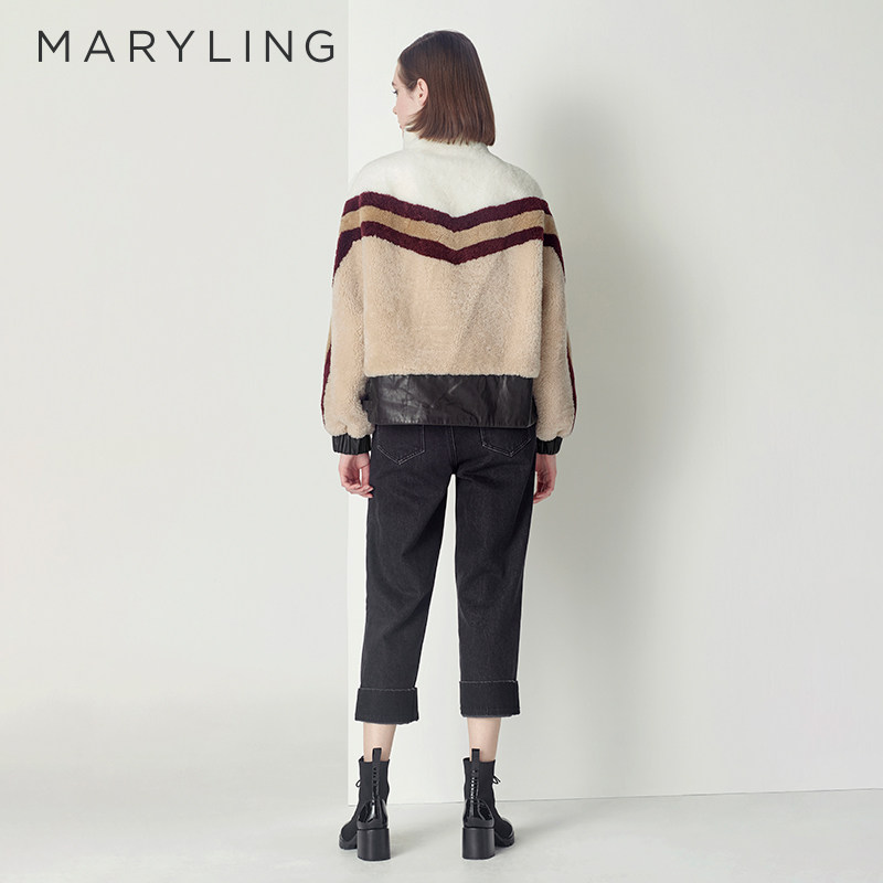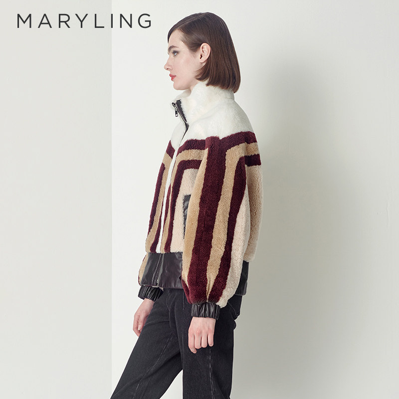 MARYLING玛俪琳冬季浅驼色条纹皮草皮毛一体短外套A1CHW9R070