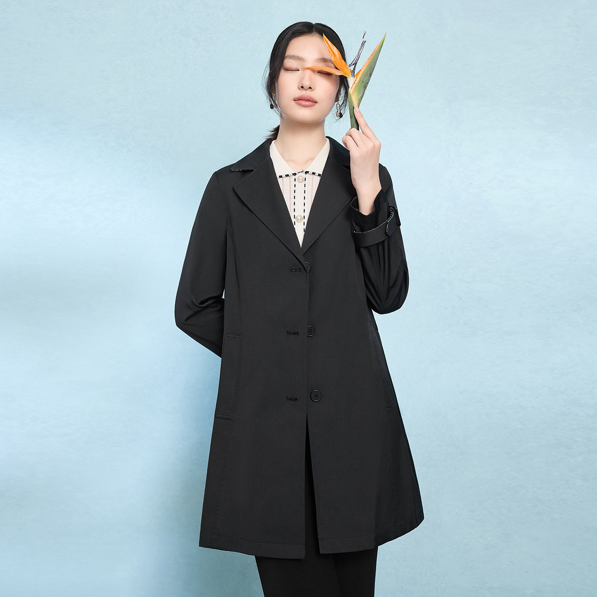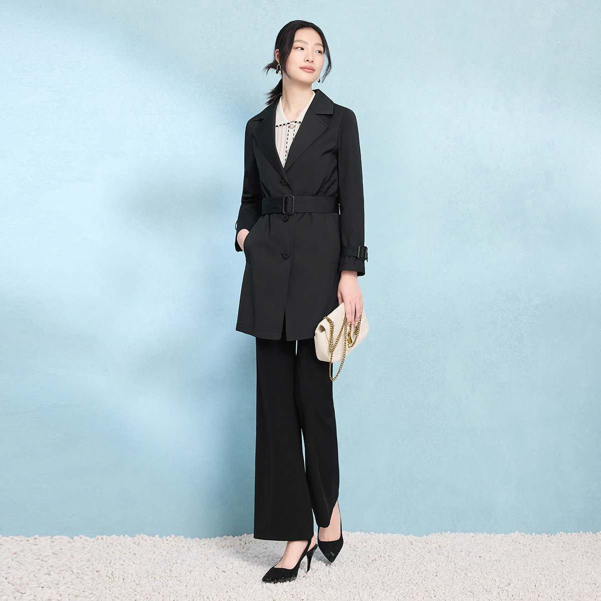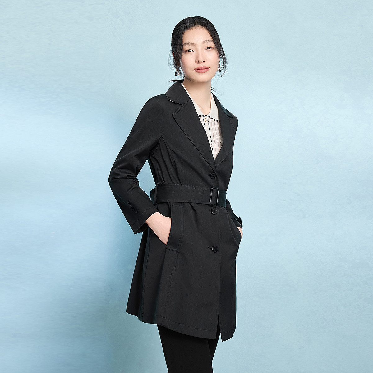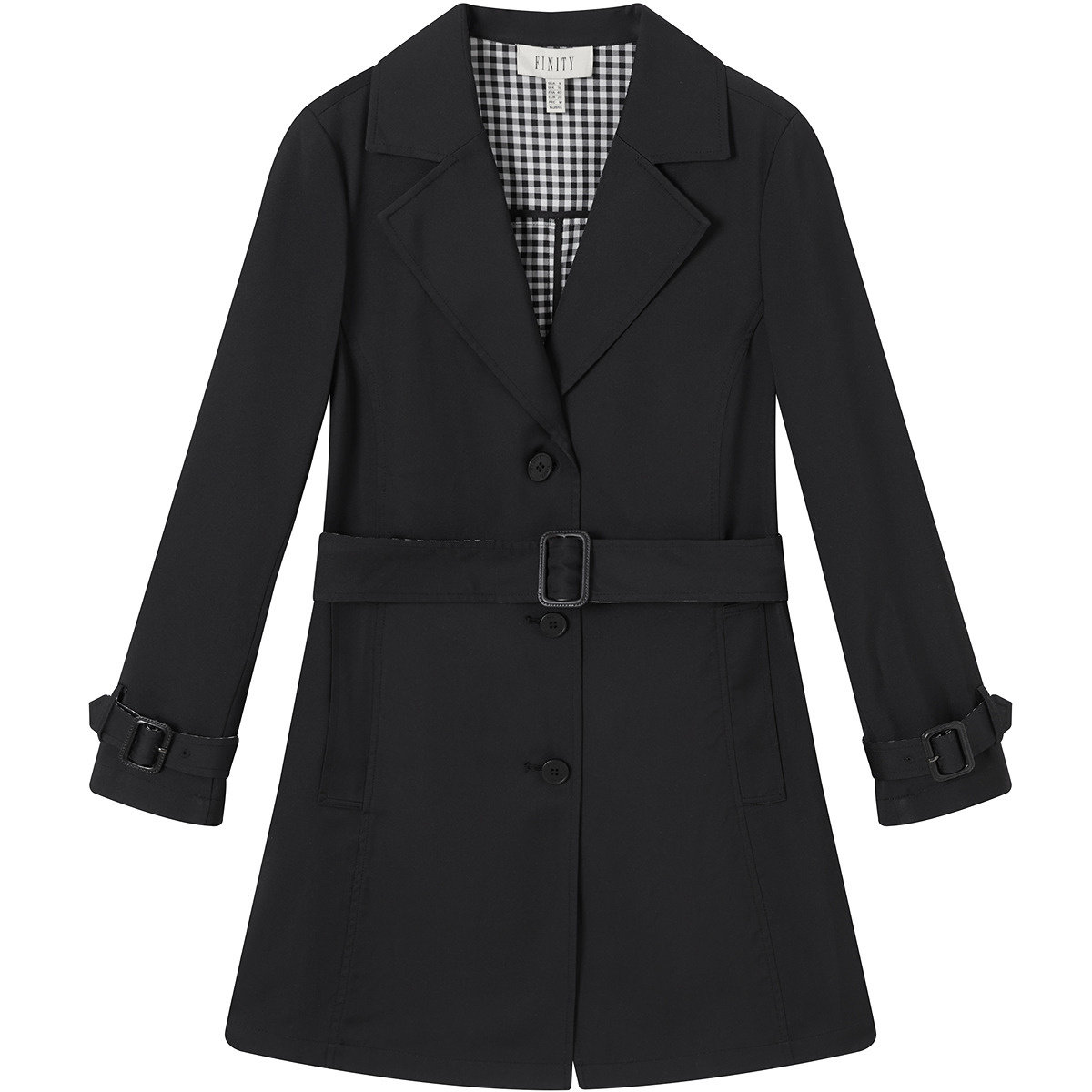 FINITY菲妮迪风衣2026年春季新款简约黑色系带西装领优雅外套女装