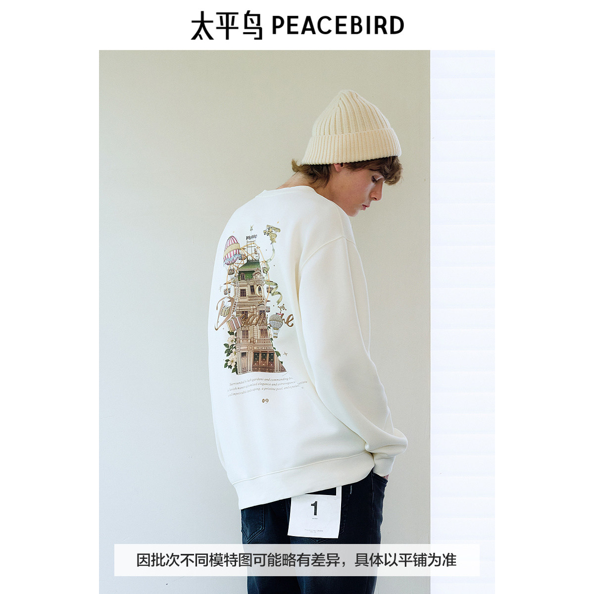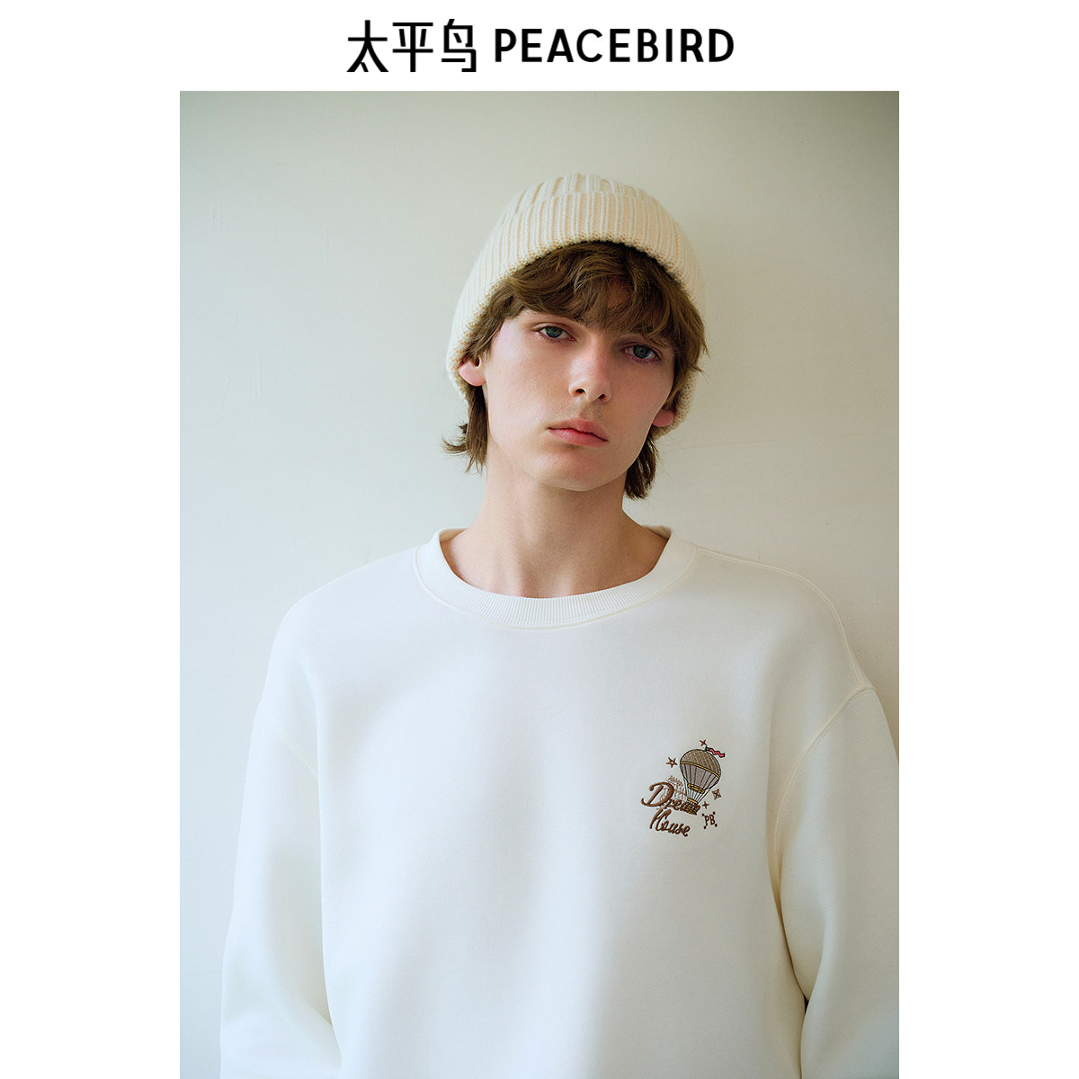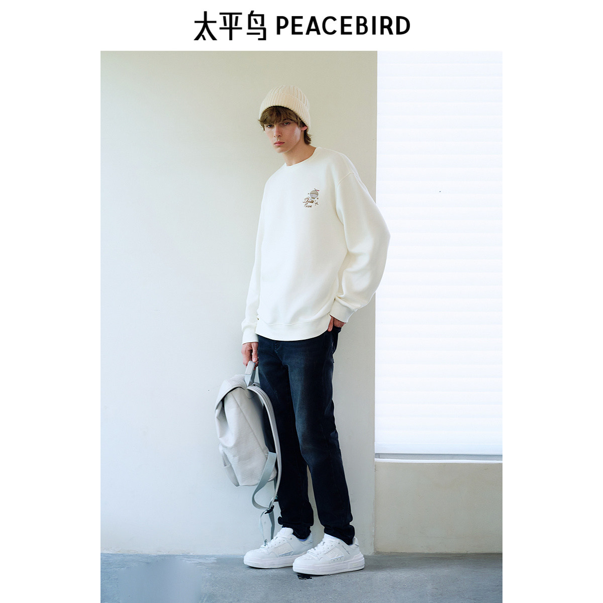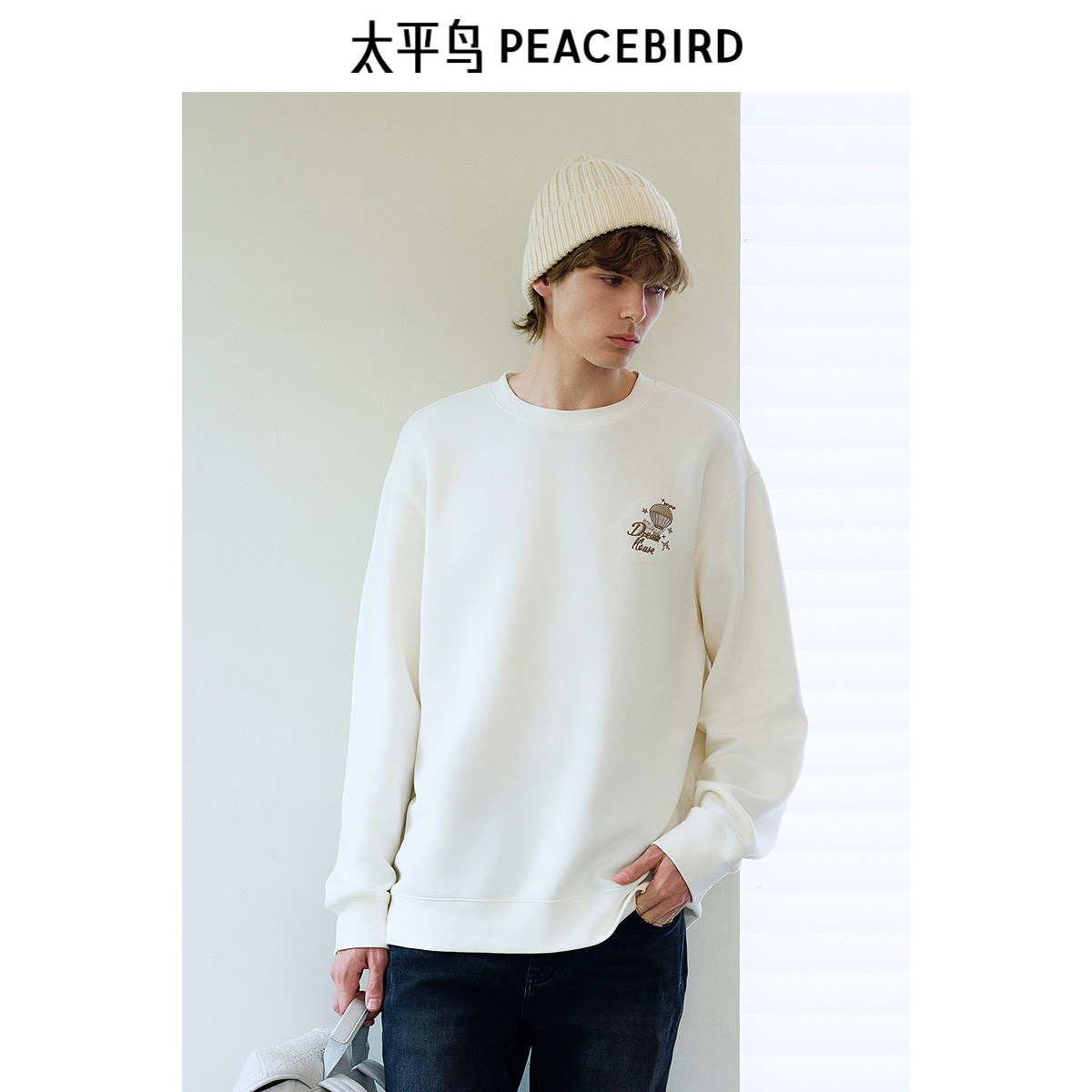 太平鸟男装 白色卫衣男潮流胸口撞色刺绣圆领套头宽松外套男