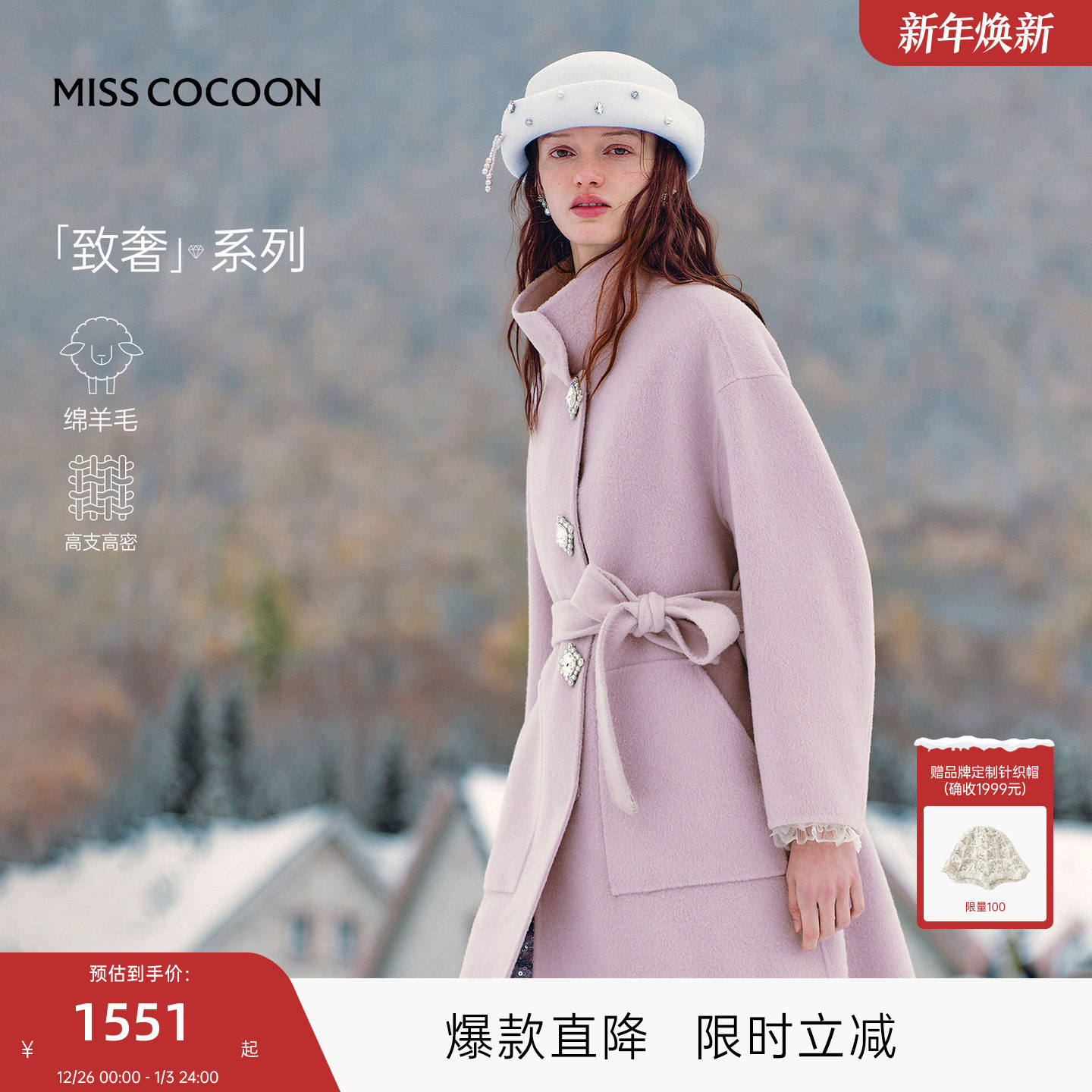 MISSCOCOON可可尼长款大衣女2025秋冬新款紫色绵羊毛立领毛呢外套