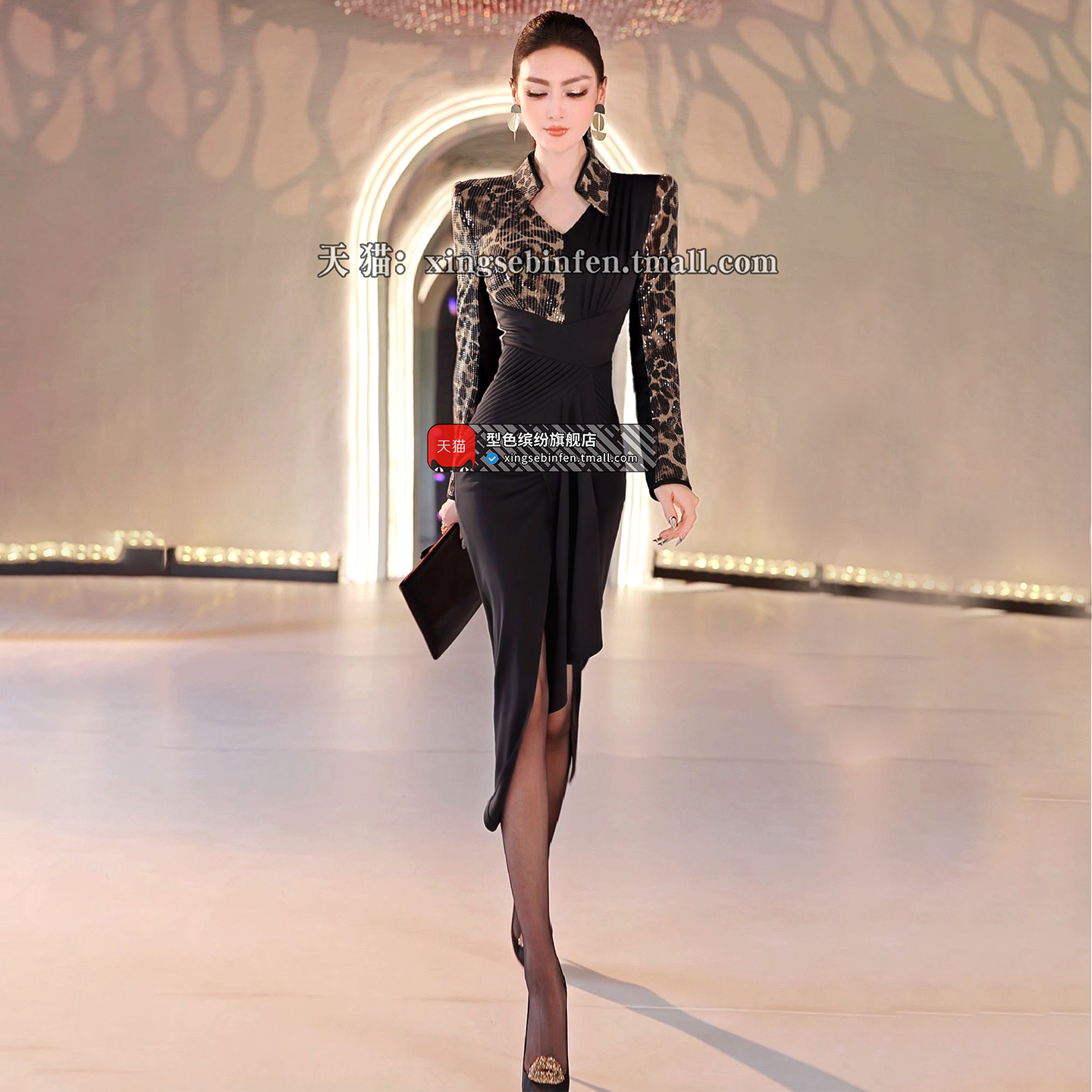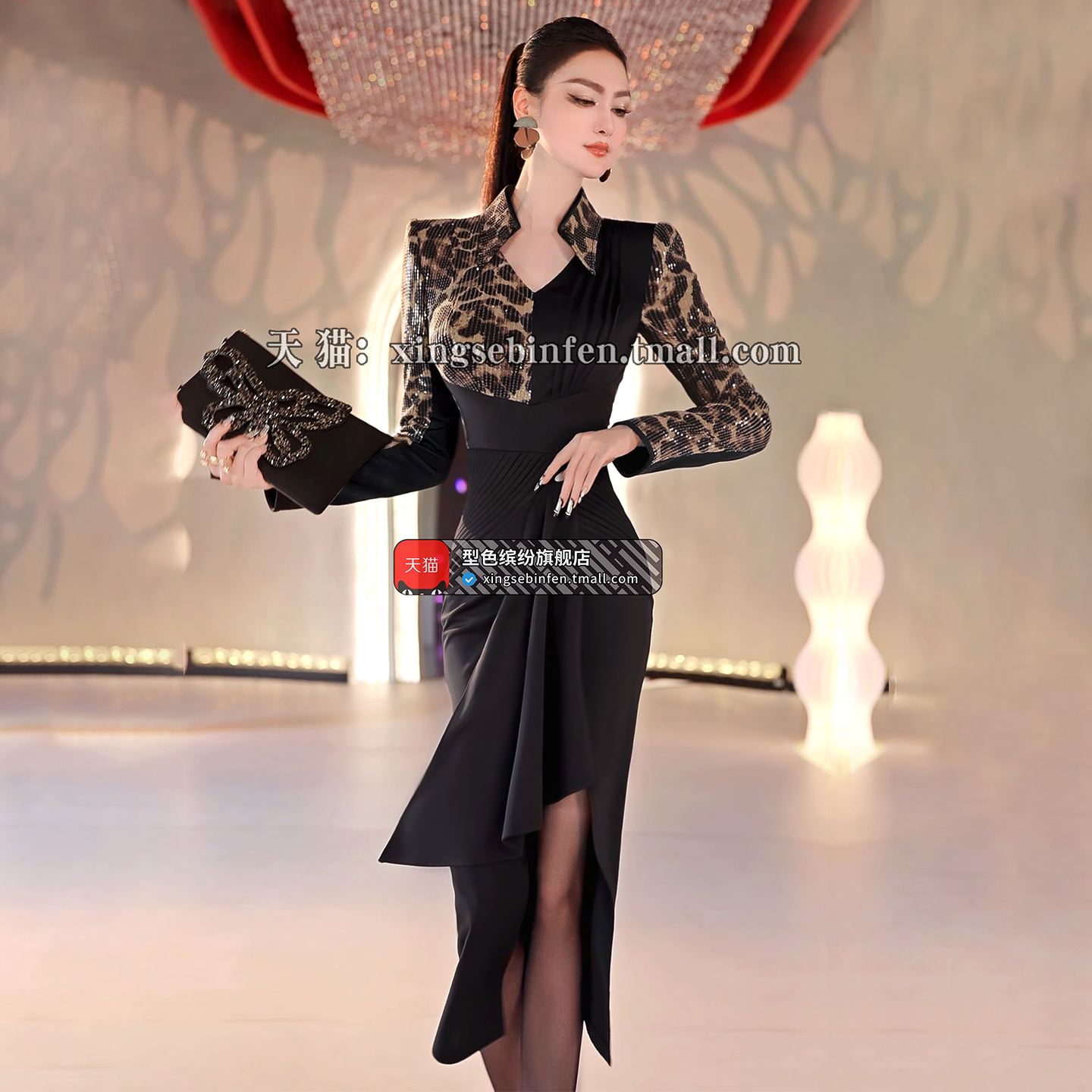 立秋欧美珠片豹纹拼接撞色长裙2025新款气质减龄不规则裙摆连衣裙