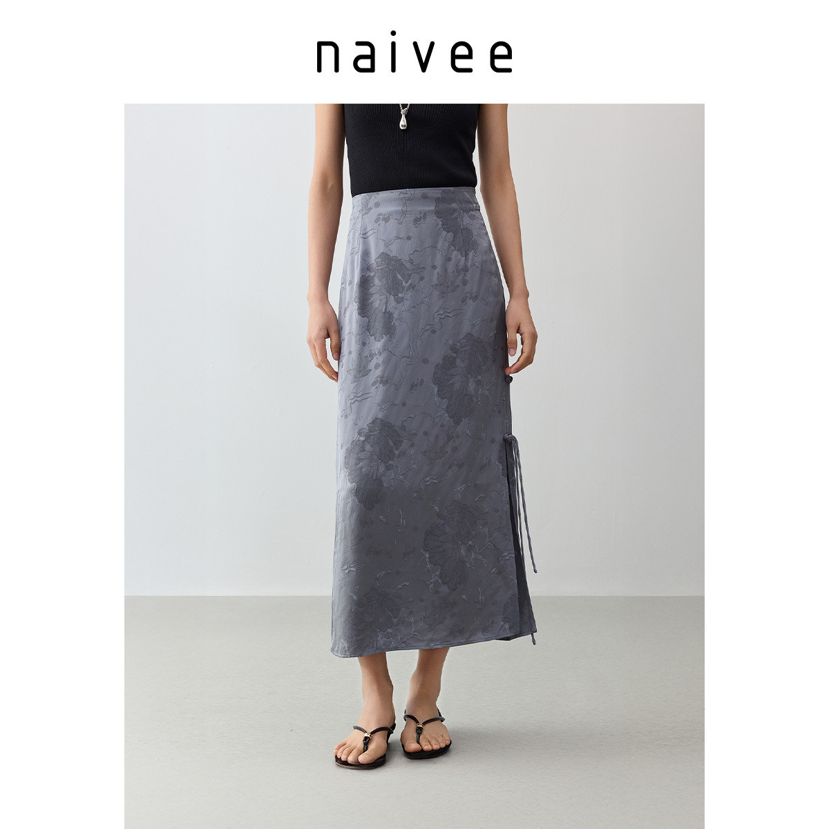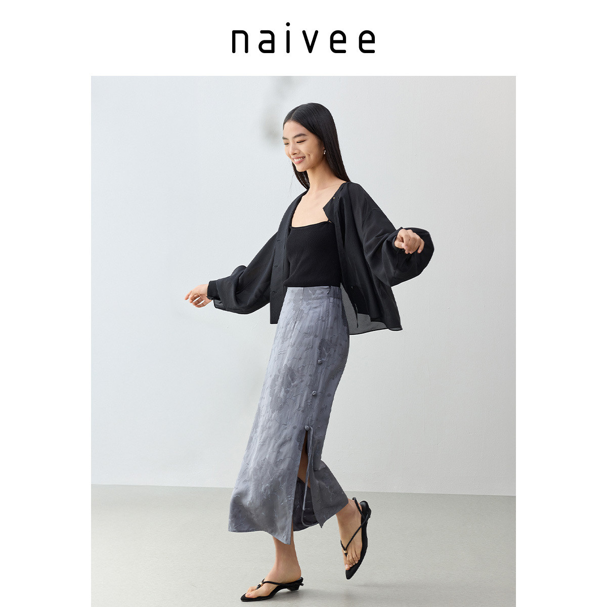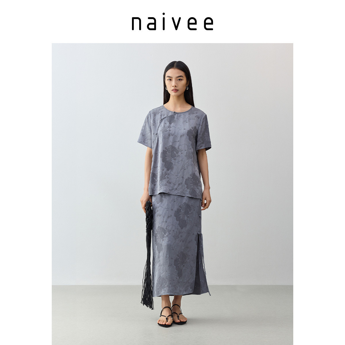 炒色人丝提花』naivee纳薇新中式直筒半身裙女25夏新款侧开衩长款