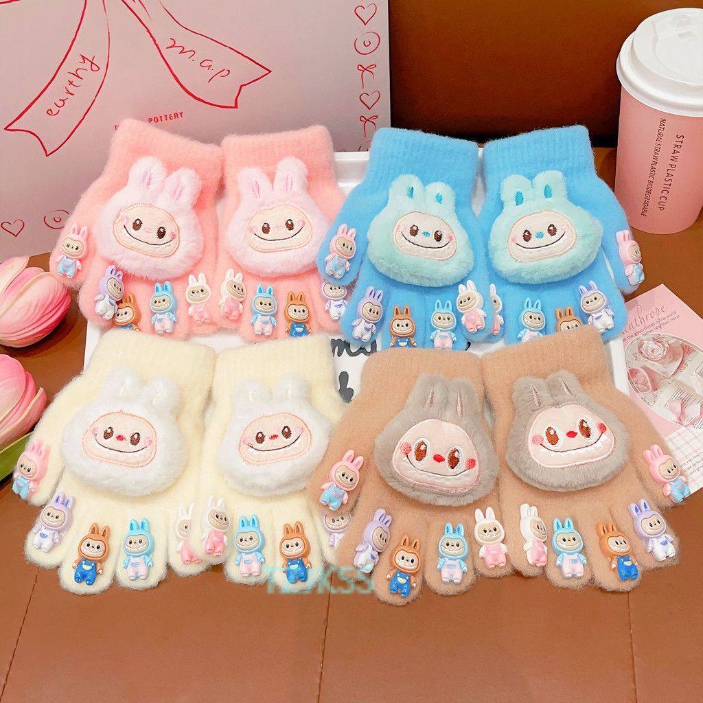2025新款拉布手套保暖毛线儿童幼儿学生美甲户外卡通半指毛绒粉色