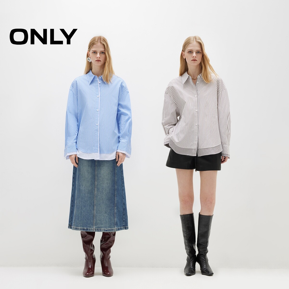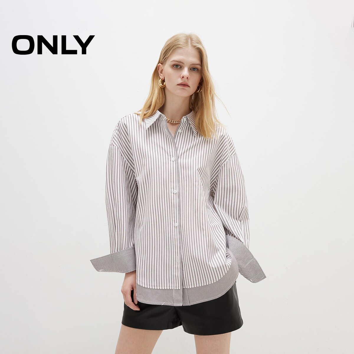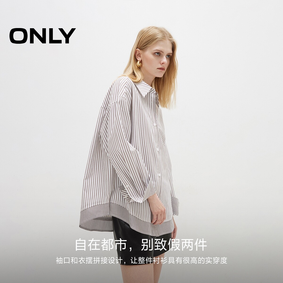 ONLY2026春季新款宽松翻领落肩条纹层次拼接假两件长袖衬衫上衣女