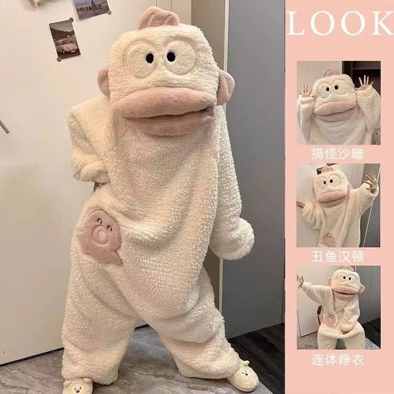 丑鱼连体睡衣女珊瑚绒加厚保暖秋冬季卡通搞怪大嘴鱼睡袍家居服男