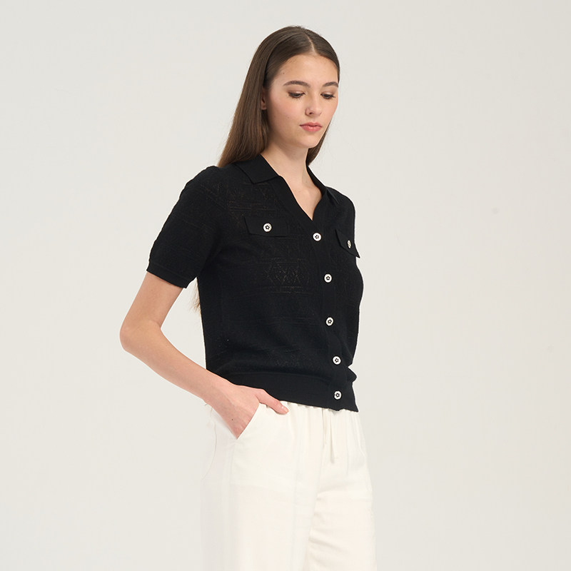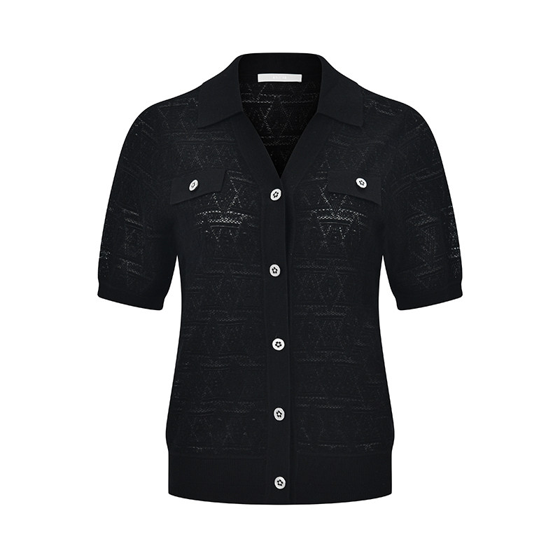 RARE威雅女装 夏季新款V领短袖羊毛衫女字母提花黑色短袖毛衫