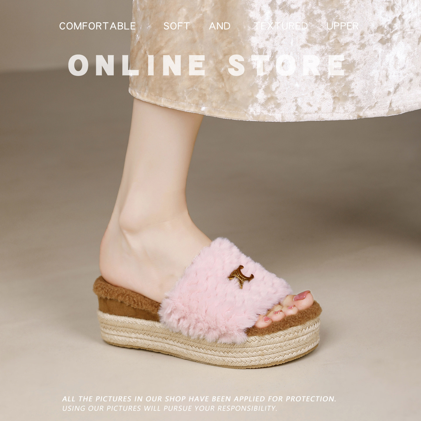 豹纹毛毛一字拖女外穿松糕厚底高级感毛毛鞋家居用一脚蹬增高毛拖