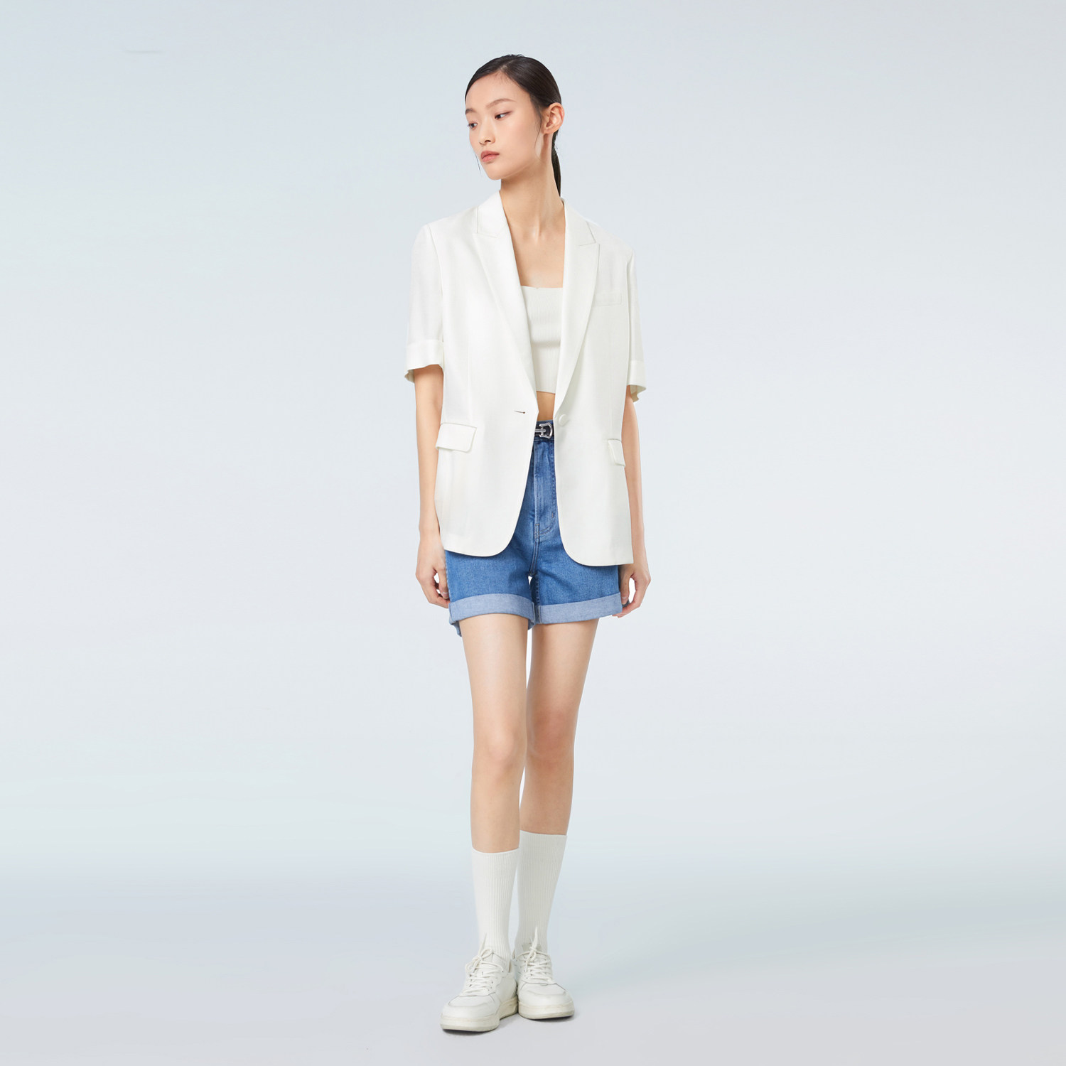 OVV春夏热卖女装醋酸仿麻时尚一粒扣休闲短袖套装西服外套