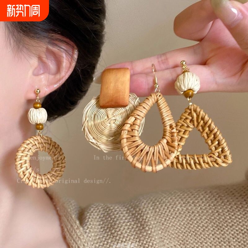 波西米亚草编流苏耳环女海边度假风耳坠配饰夏天旅游夸张耳饰爱心