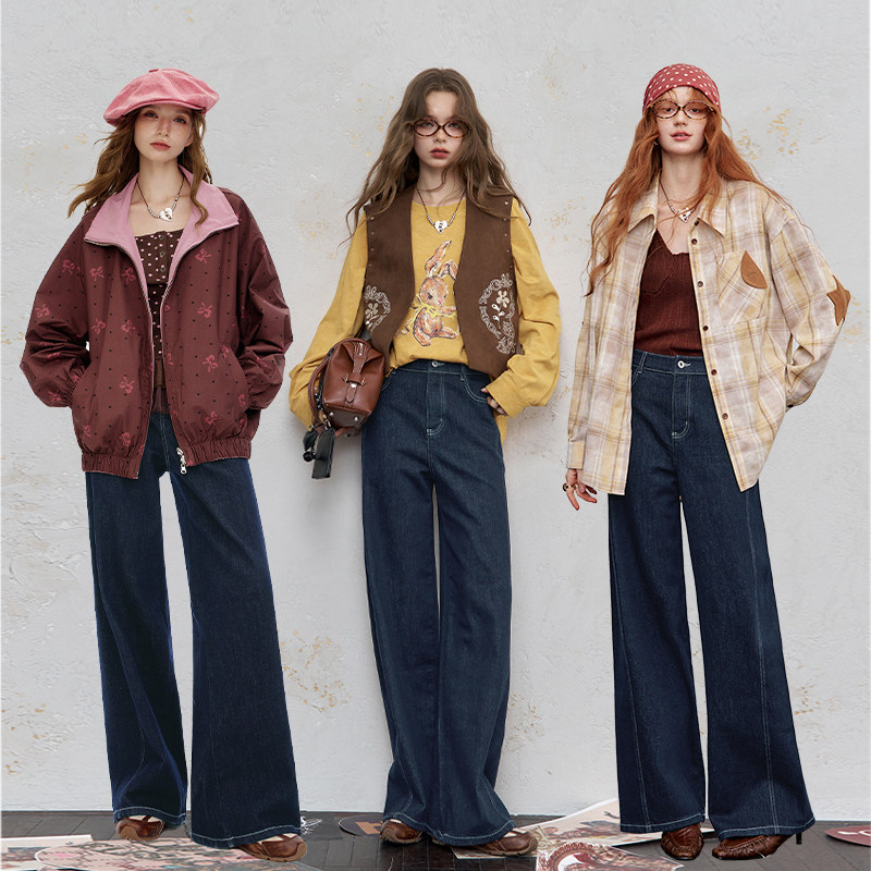自然涩美式小熊牛仔裤女春秋新款韩系小众设计感阔腿裤子冬季加绒