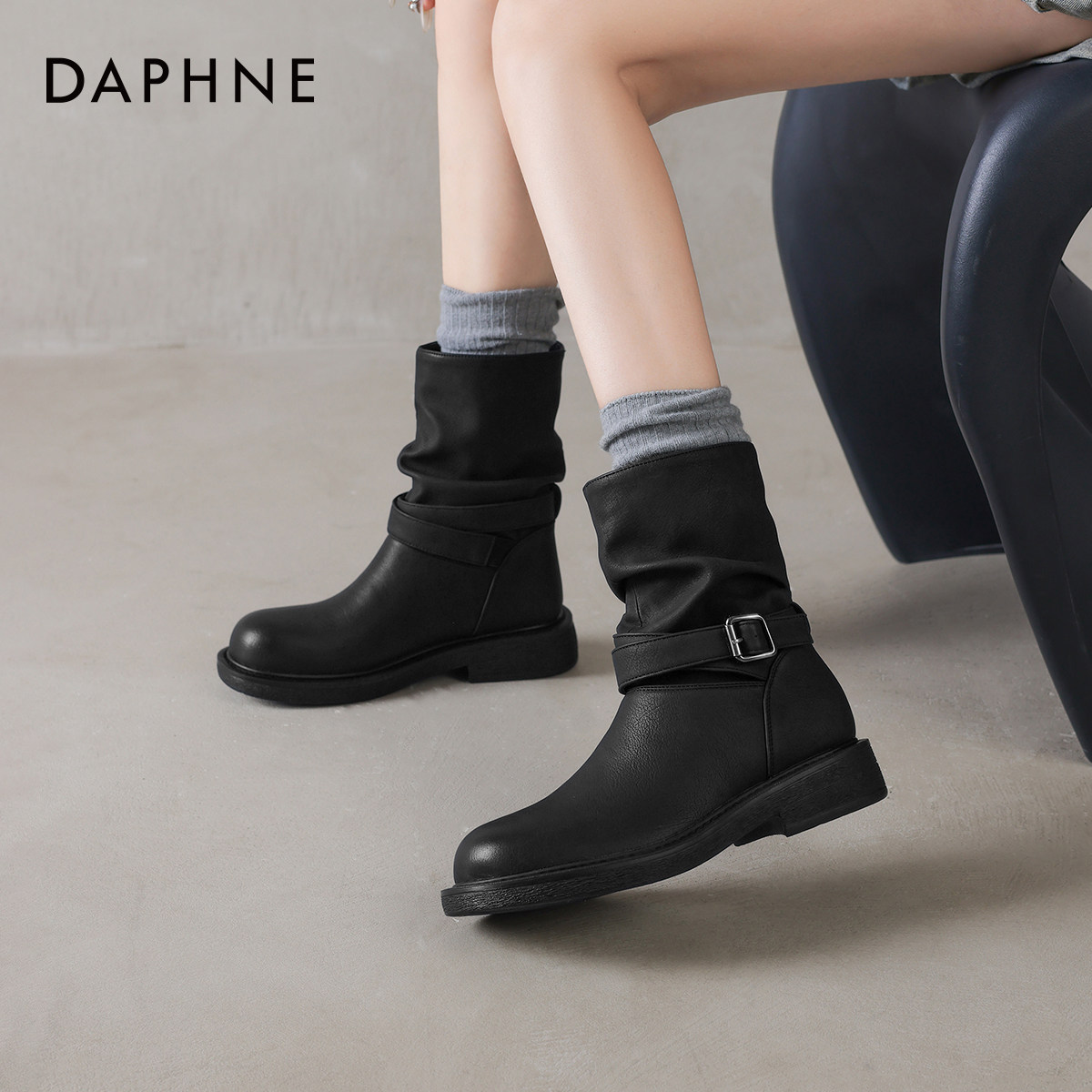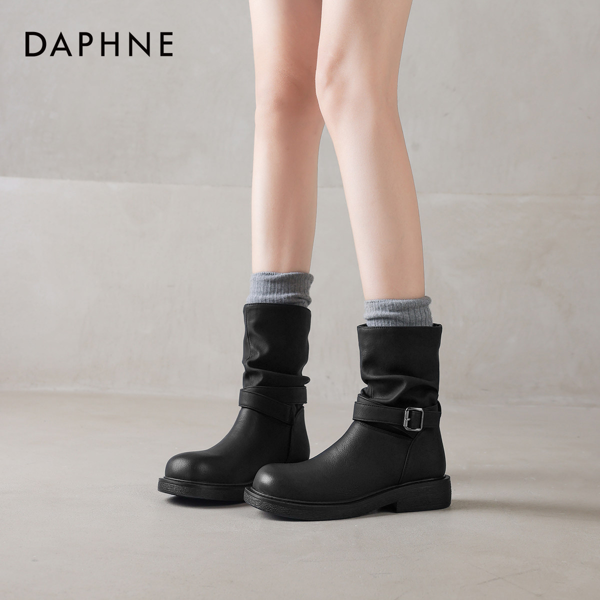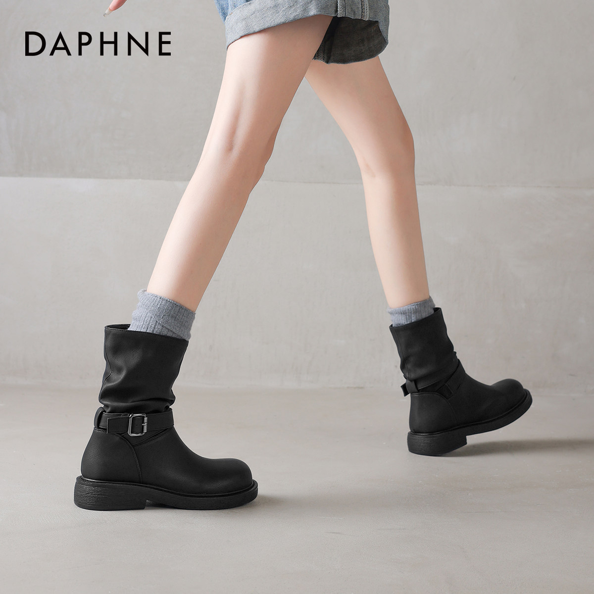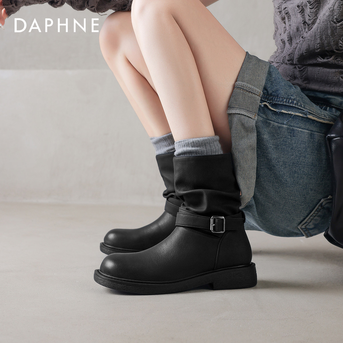 达芙妮黑色短靴子女2026新款春季厚底骑士靴粗跟春款堆堆靴裤管靴