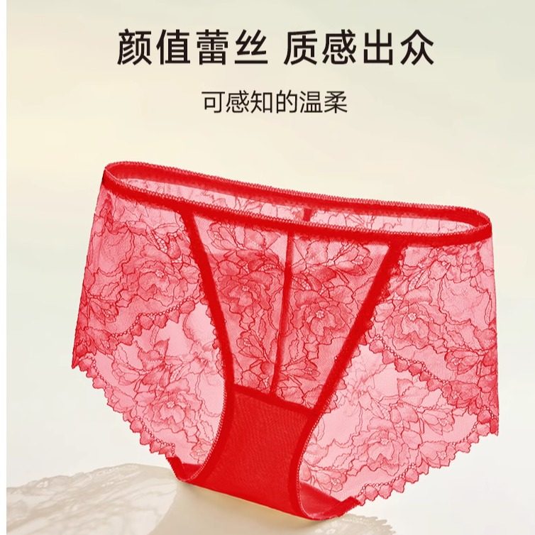 曼妮芬性感蕾丝三角裤女内裤轻薄中腰纯棉底裆底裤本命年红短裤