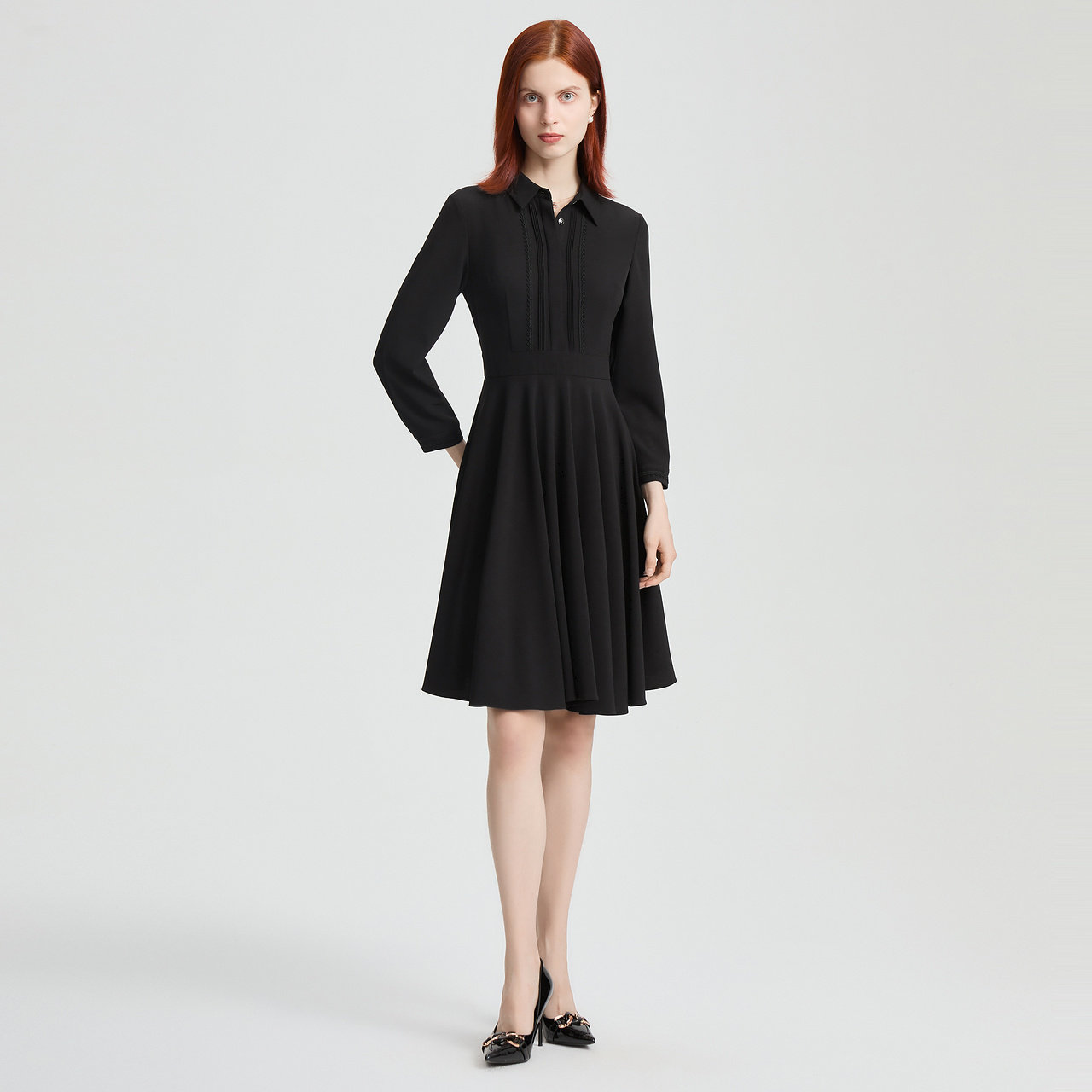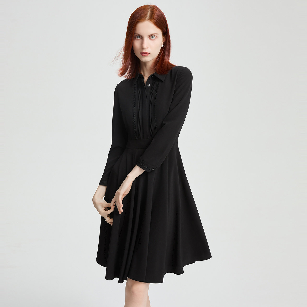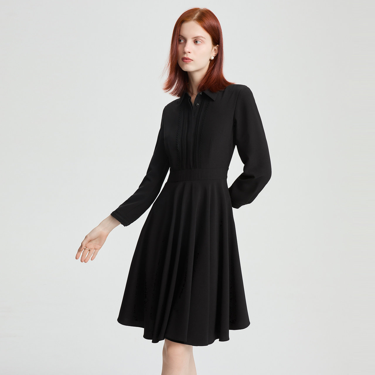 菲妮迪衬衫领连衣裙2025年秋季新款设计感简约气质显瘦小黑裙女
