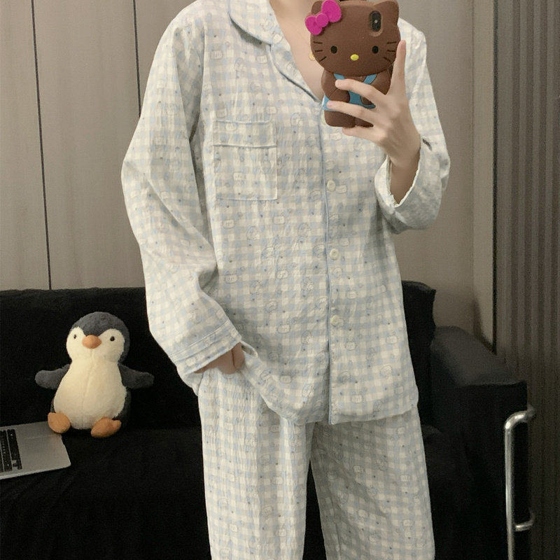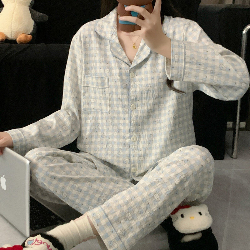 红豆HelloKitty大码睡衣女春秋季长袖云朵纯棉纱家居服有胸垫条纹