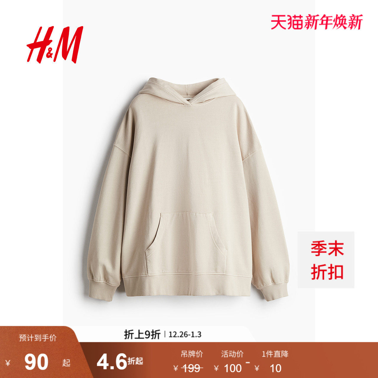 HM女装卫衣冬季潮流时尚简约柔软长袖大廓形美式连帽衫1243666