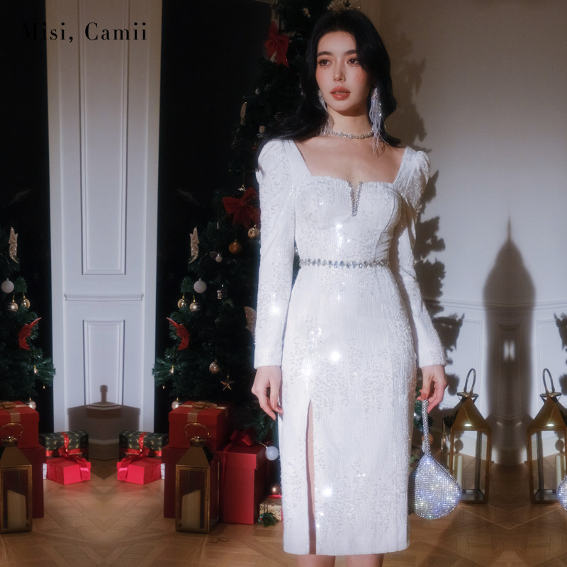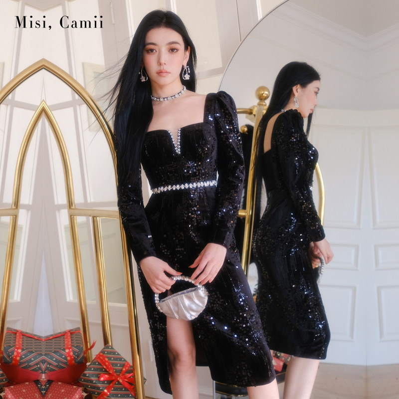 Misi.Camii2023冬季新款女士珠片刺绣丝绒长连衣裙名媛气质礼服裙