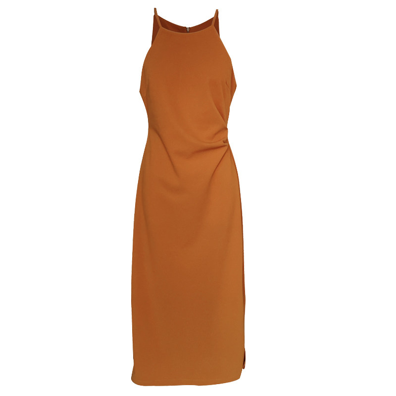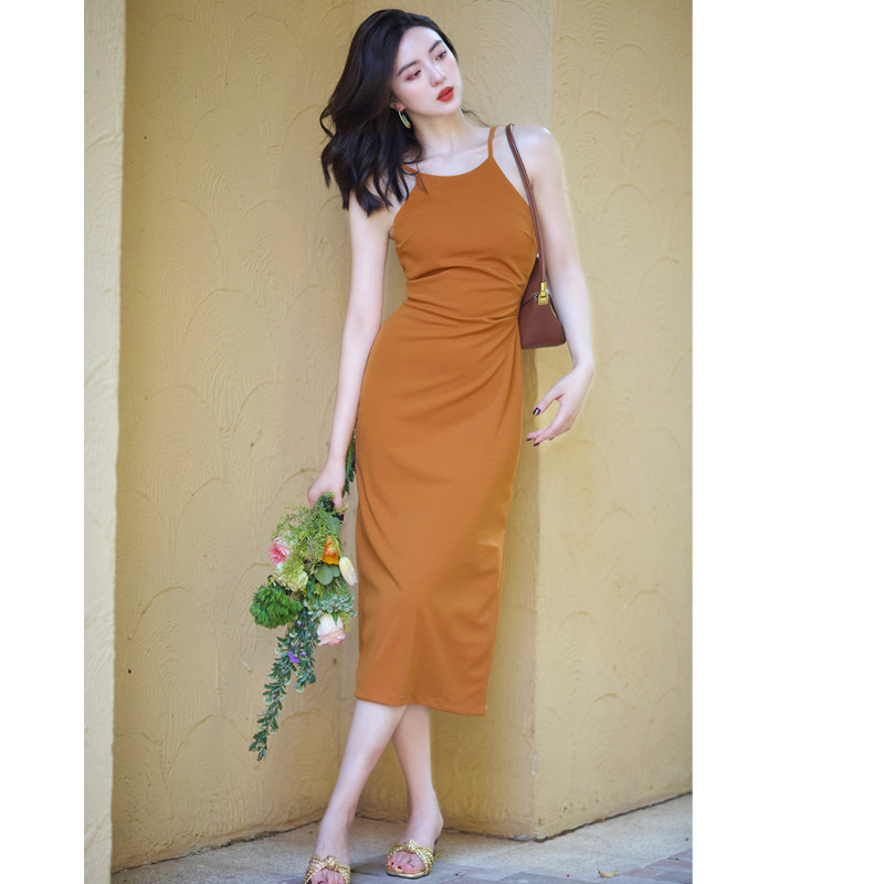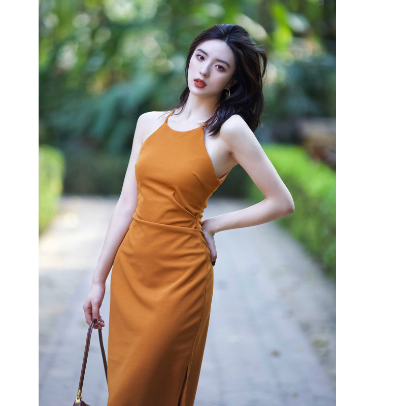 法式挂脖连衣裙御姐露背吊带气质裙子修身弹力包臀中长裙欧美女夏