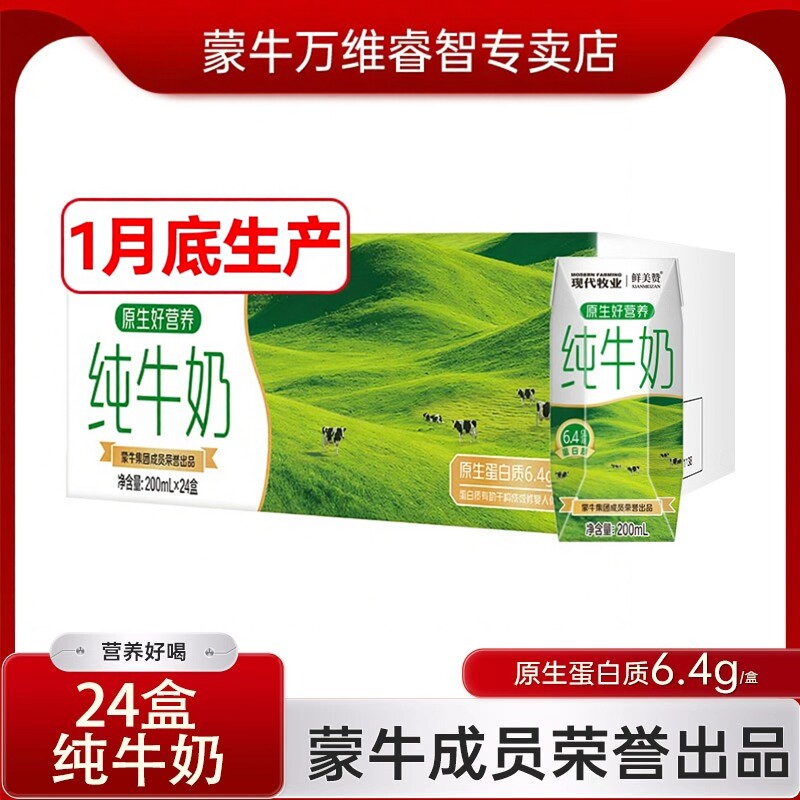 1月底产蒙牛纯牛奶200ml*24盒整箱现代牧业鲜美赞早餐纯牛奶