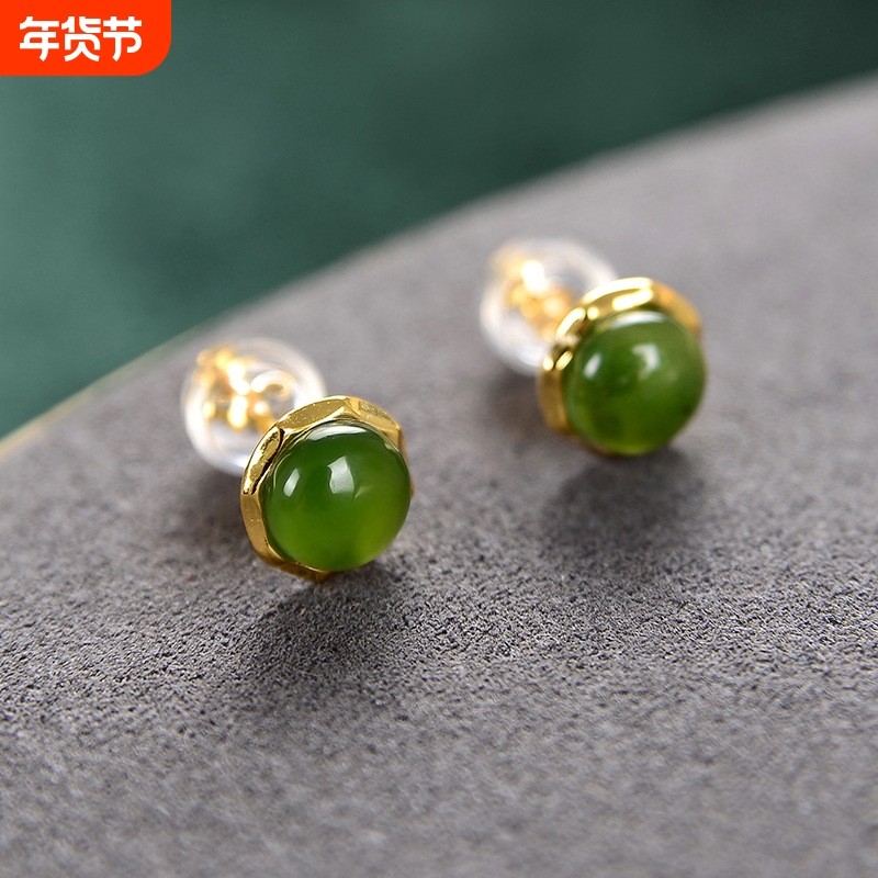 壹鹿银S925纯银镀金和田玉碧玉圆珠复古个性简约气质女士耳钉耳饰