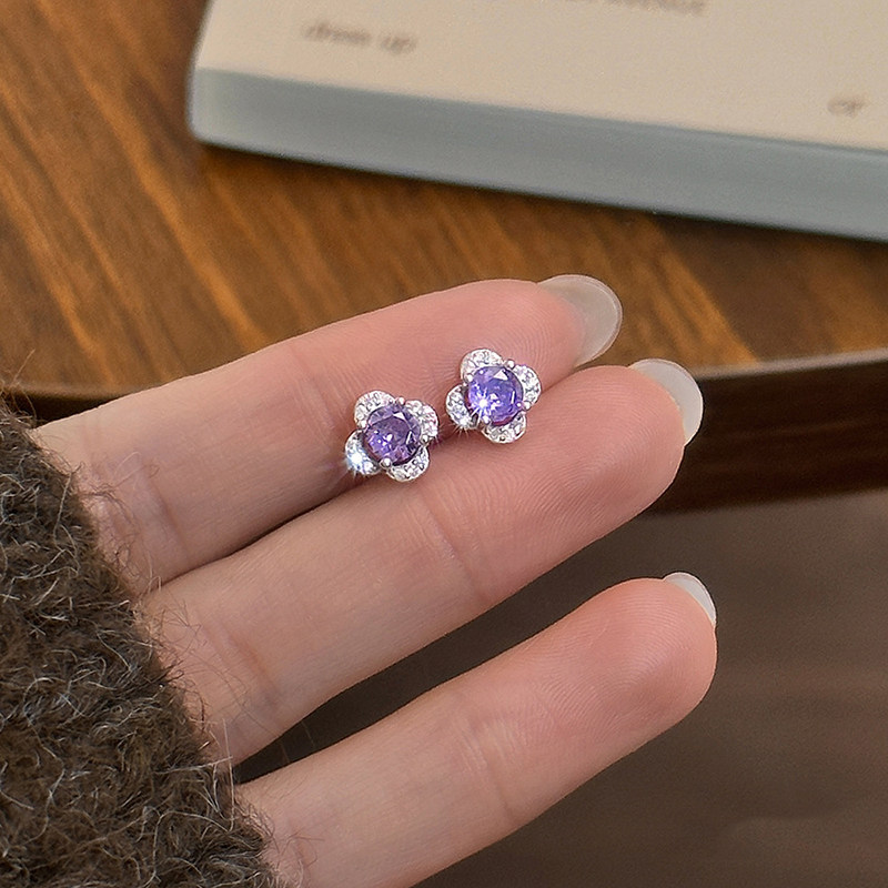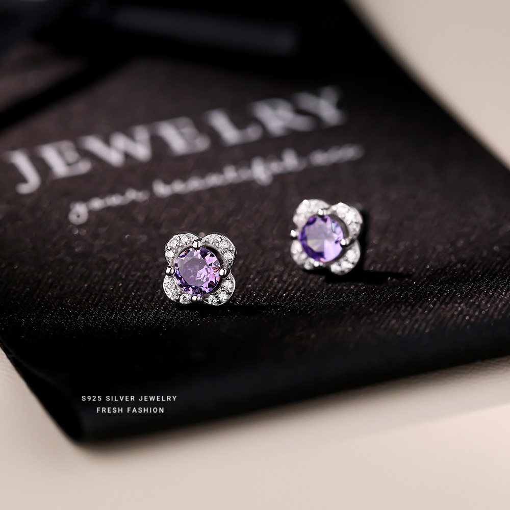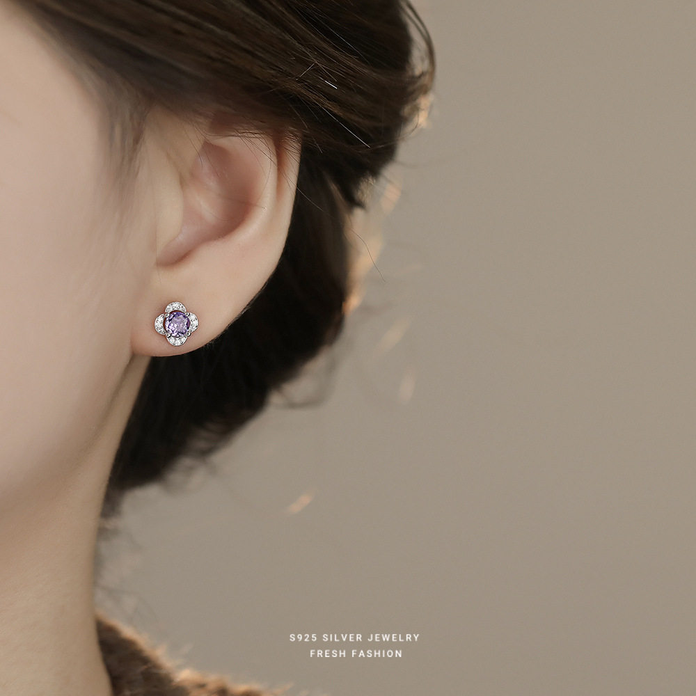 S925纯银紫色四叶草耳钉女小众轻奢高级感小巧精致耳饰新年礼物