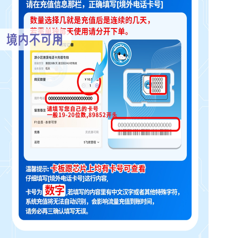 请填写卡板或SIM卡背部号码不要有空格和换行 发货成功等于充值完成,充值成功后不支持退款。 充值完成后5分钟左右到账