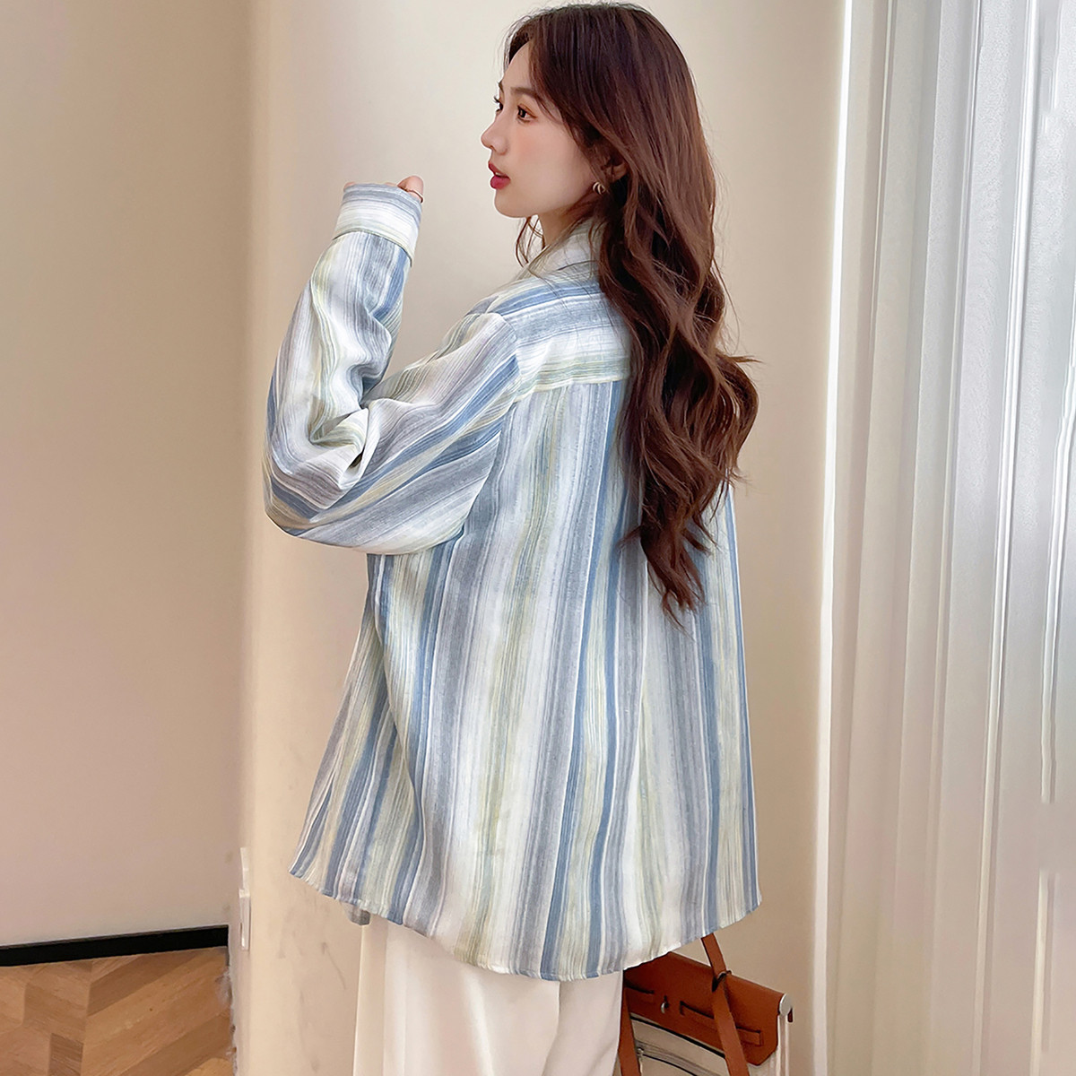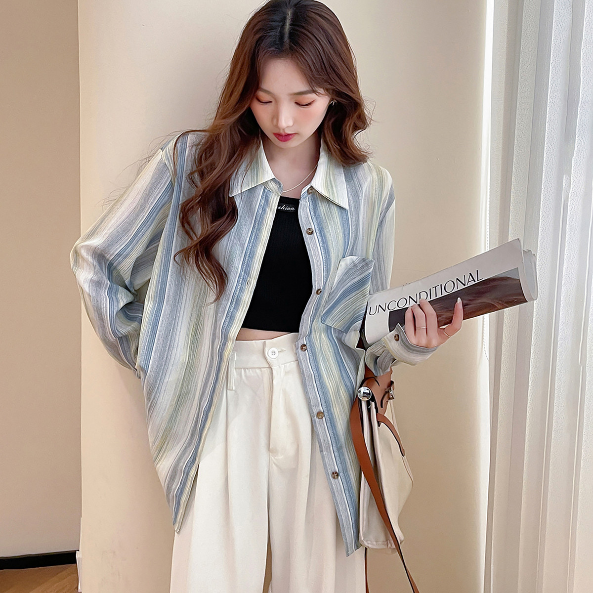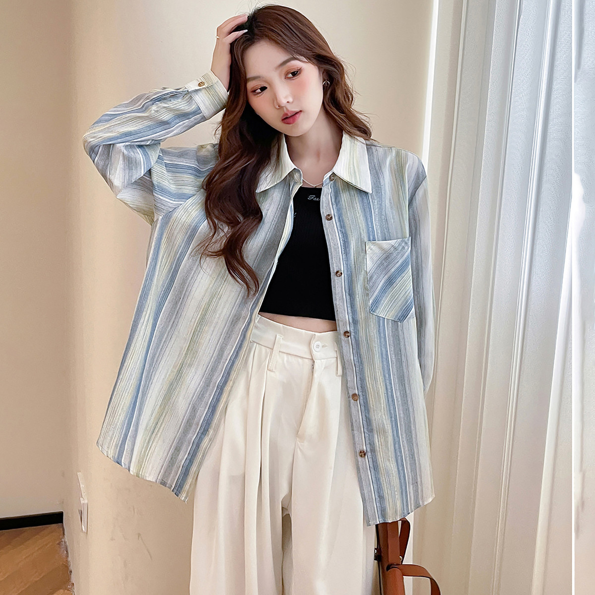 【四季叠搭】秋冬新款百搭条纹无袖衬衫叠穿背心翻领衬衣内搭显瘦
