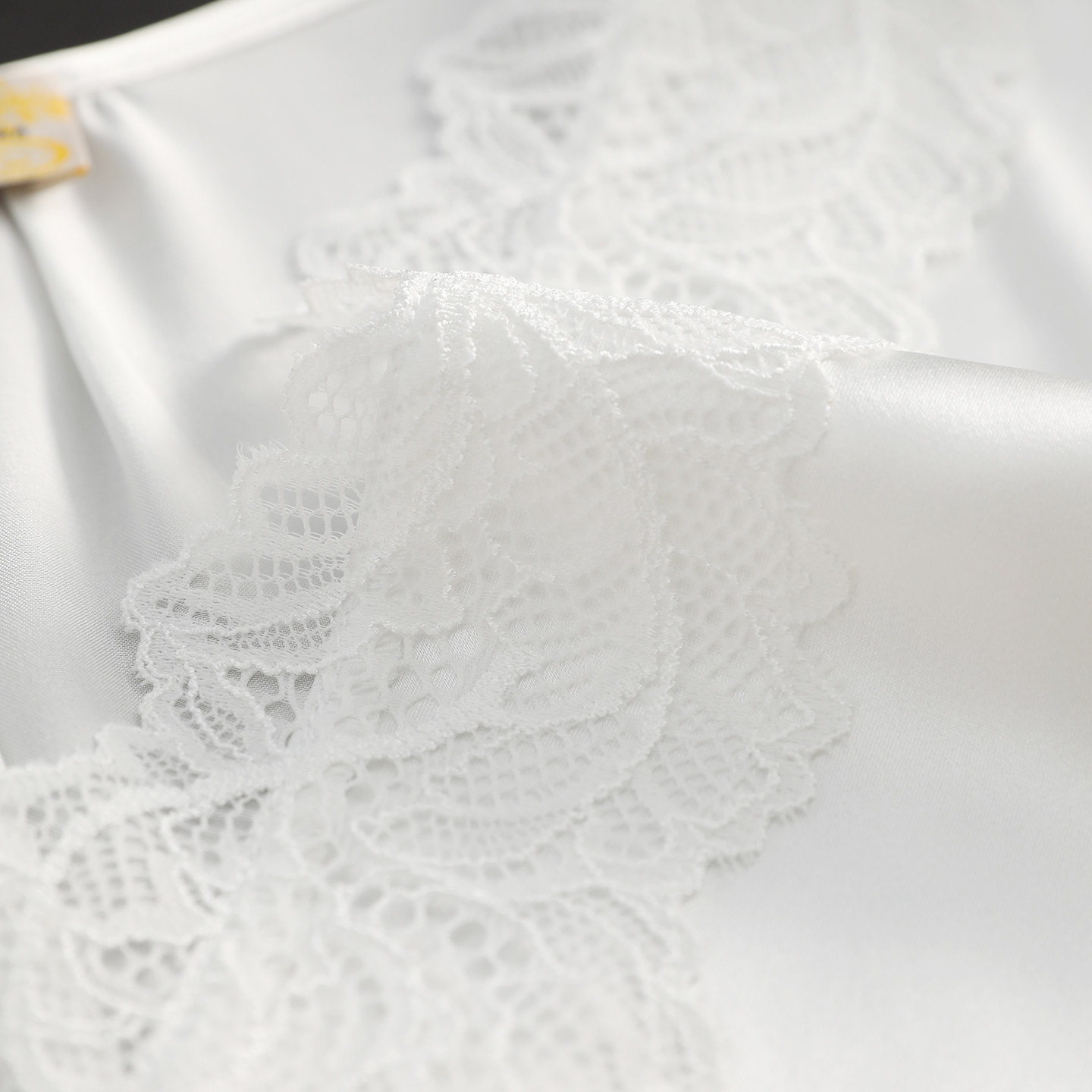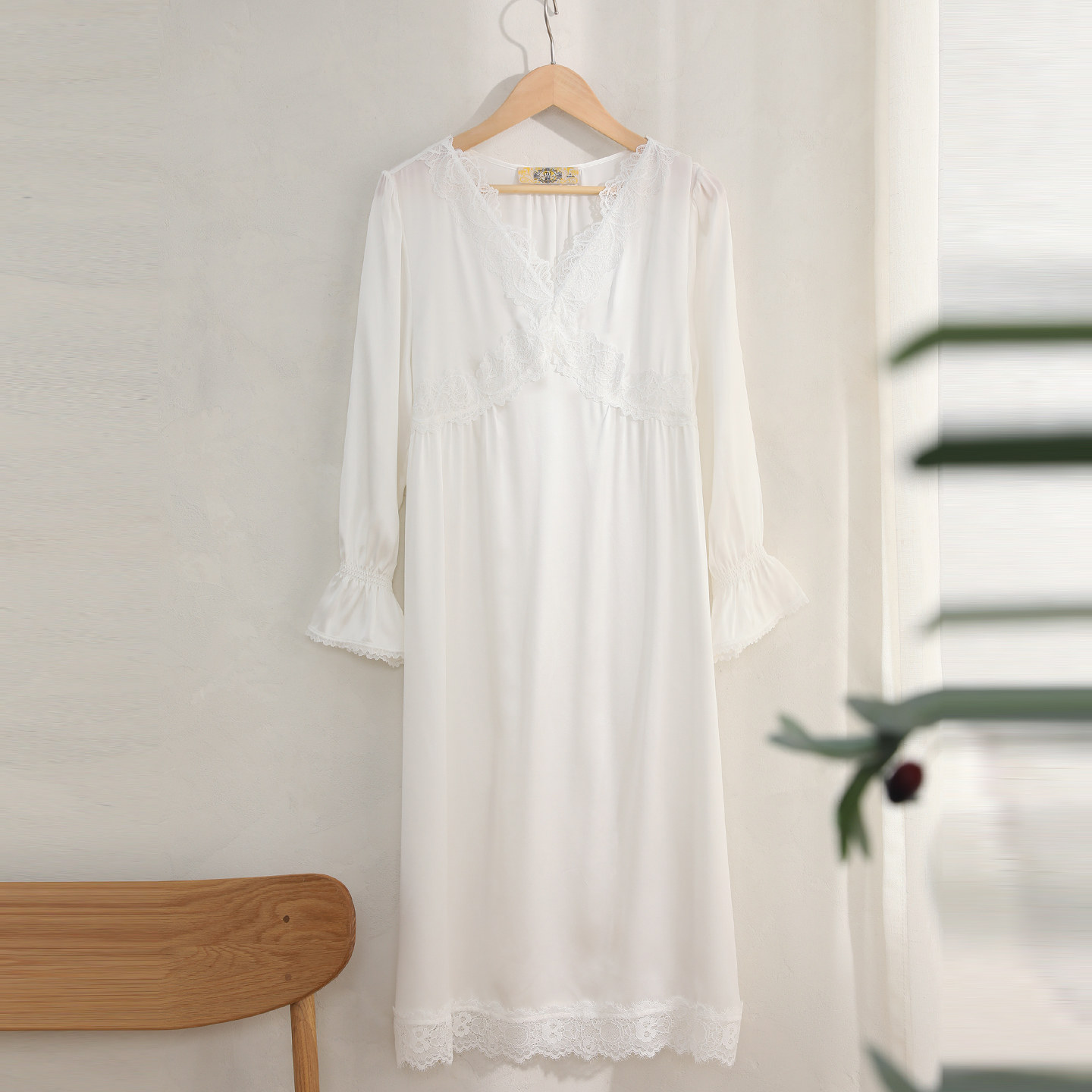 美标春秋新款长袖真丝睡裙女复古法式甜美蕾丝桑蚕丝绸睡衣家居服