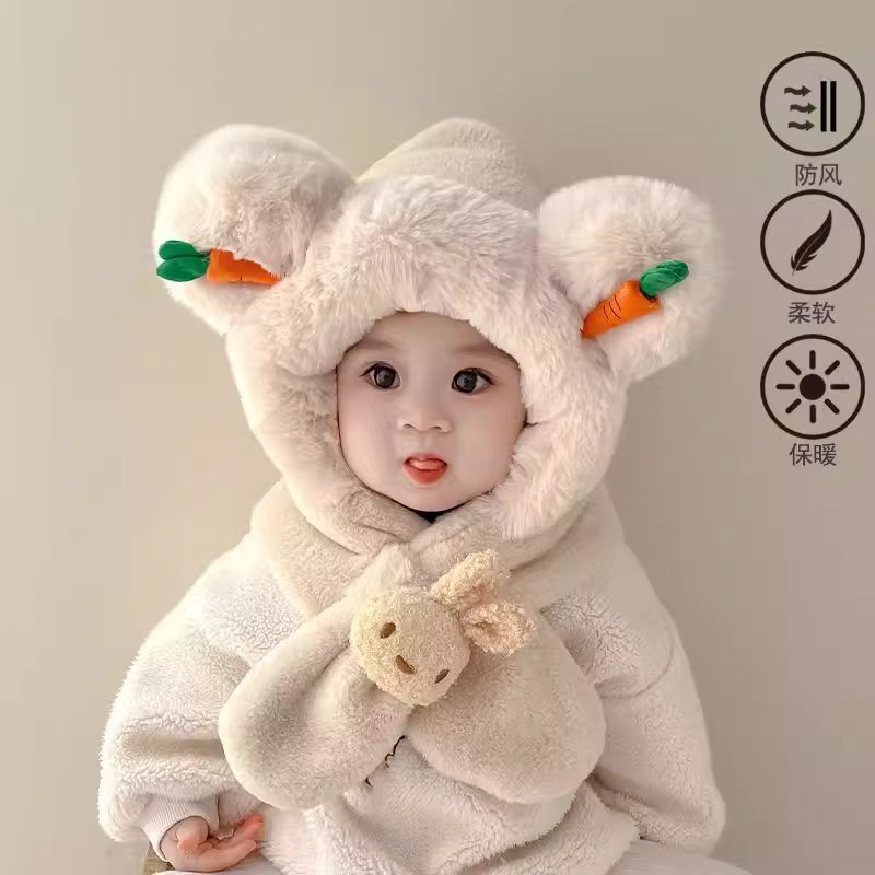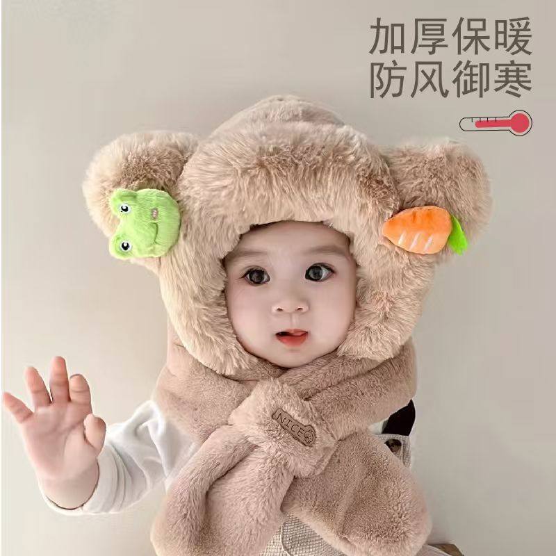 尼多熊婴儿帽子秋围脖一体宝宝毛绒帽防风护耳帽冬季保暖婴幼儿帽