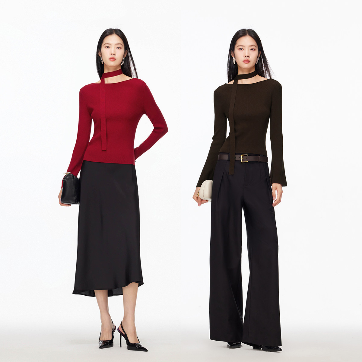 三福长袖上衣2025新款秋季圆领修身针织衫简约纯色内搭打底衫女装