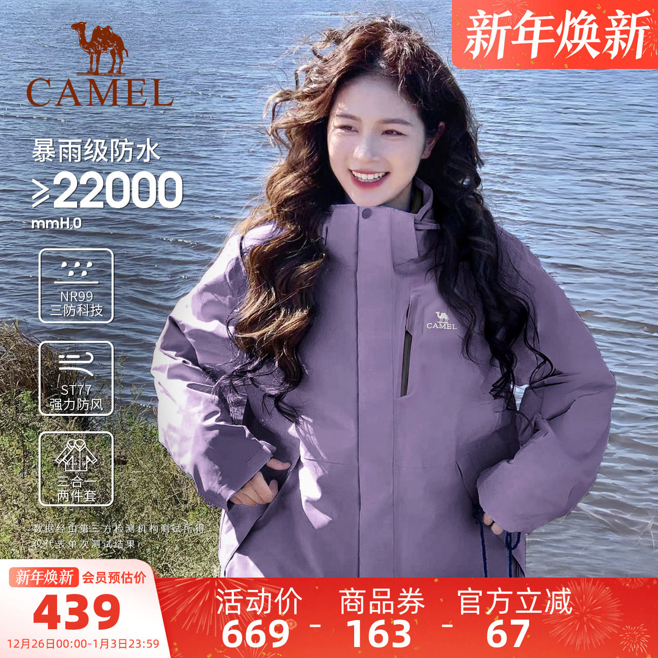 【双12超级爆品日】骆驼3514系列冲锋衣男女款三合一防风防水外套