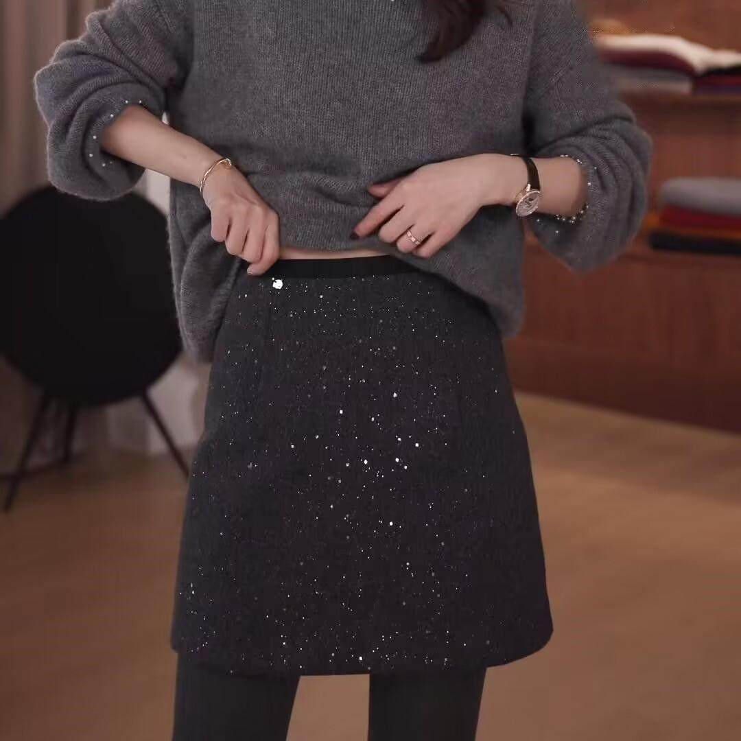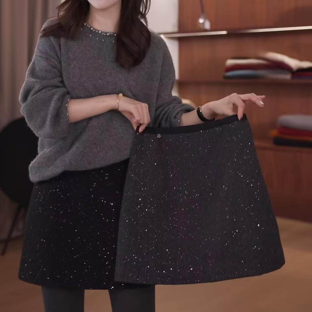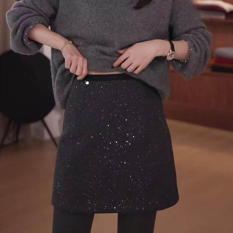 大码微胖mm闪亮片毛呢半身裙秋冬遮肉显瘦包臀裙百搭A字高腰短裙