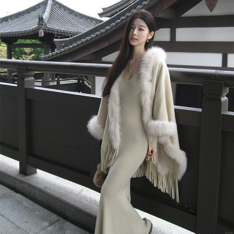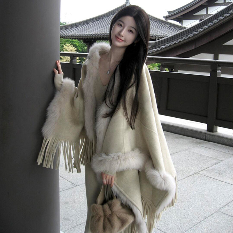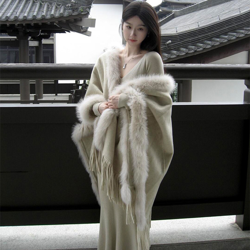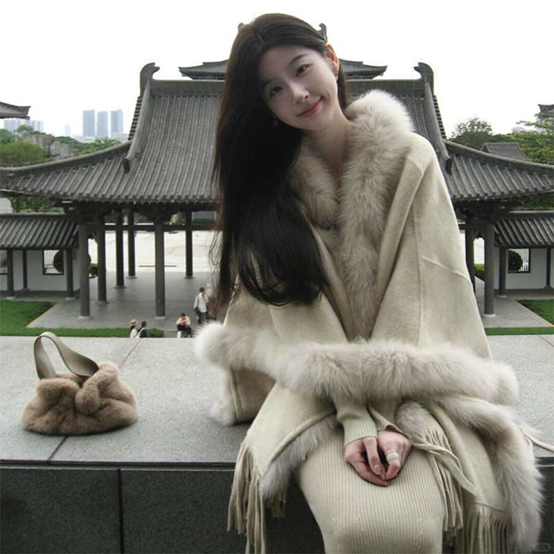2025新款白色毛领披肩女外搭冬季氛围感加厚保暖披风斗篷围巾灰色