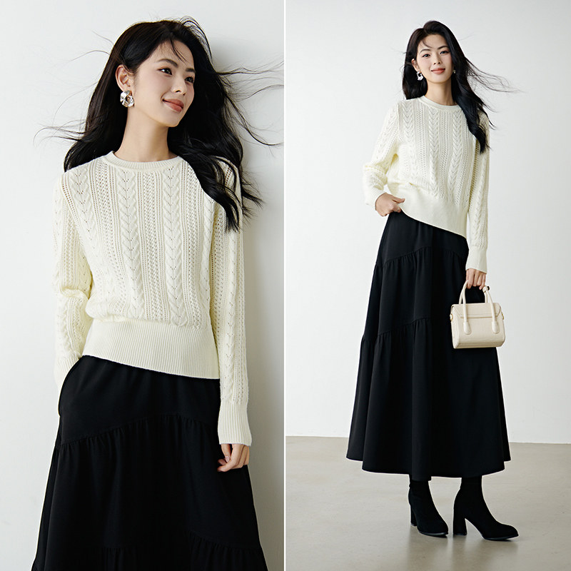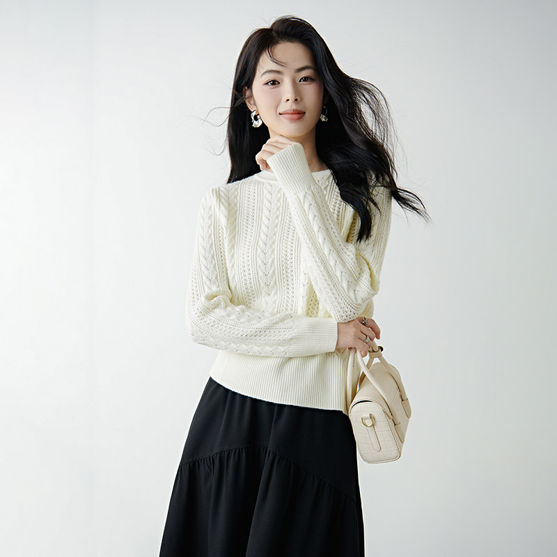 晚白2026年春季新款时尚简约圆领毛衣含羊毛柔软舒适大码针织衫女