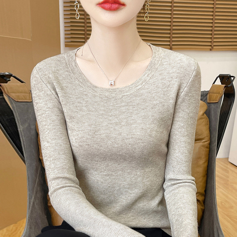 三福长袖上衣2025新款秋季圆领修身针织衫简约纯色内搭打底衫女装
