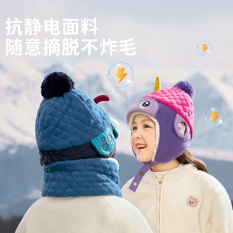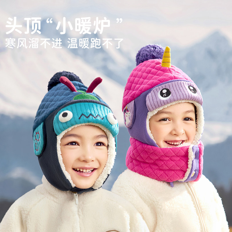 尼多熊儿童帽子围巾一体冬季防风帽宝宝毛绒护耳帽女童加厚保暖帽