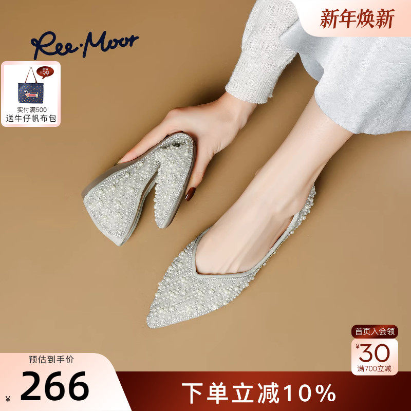 REEMOOR睿慕2025秋季新款法式珍珠尖头浅口单鞋平底鞋女鞋