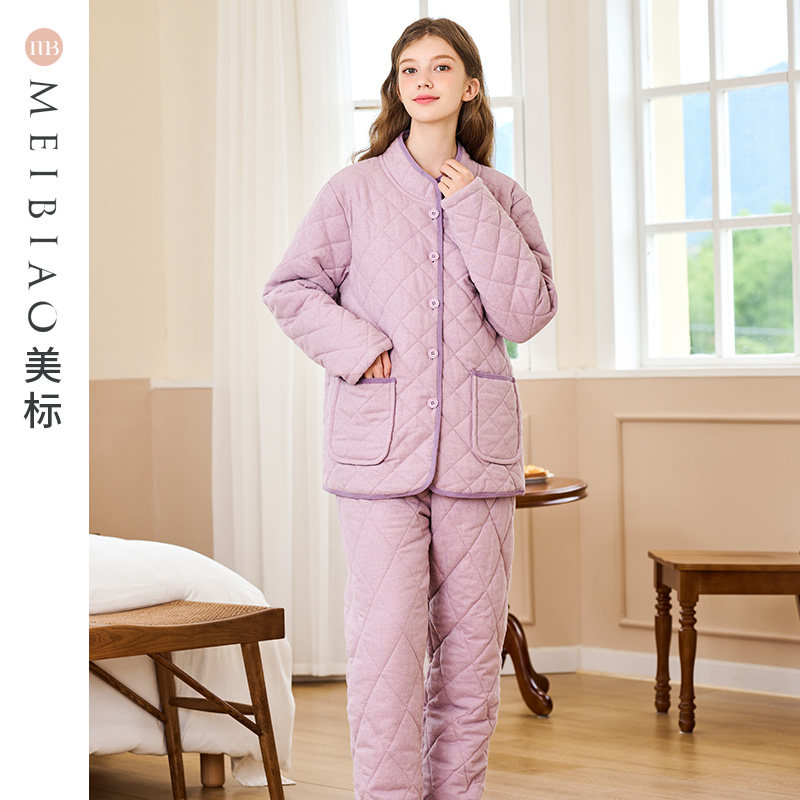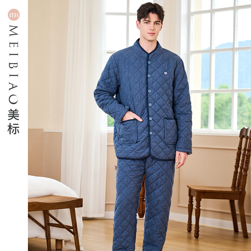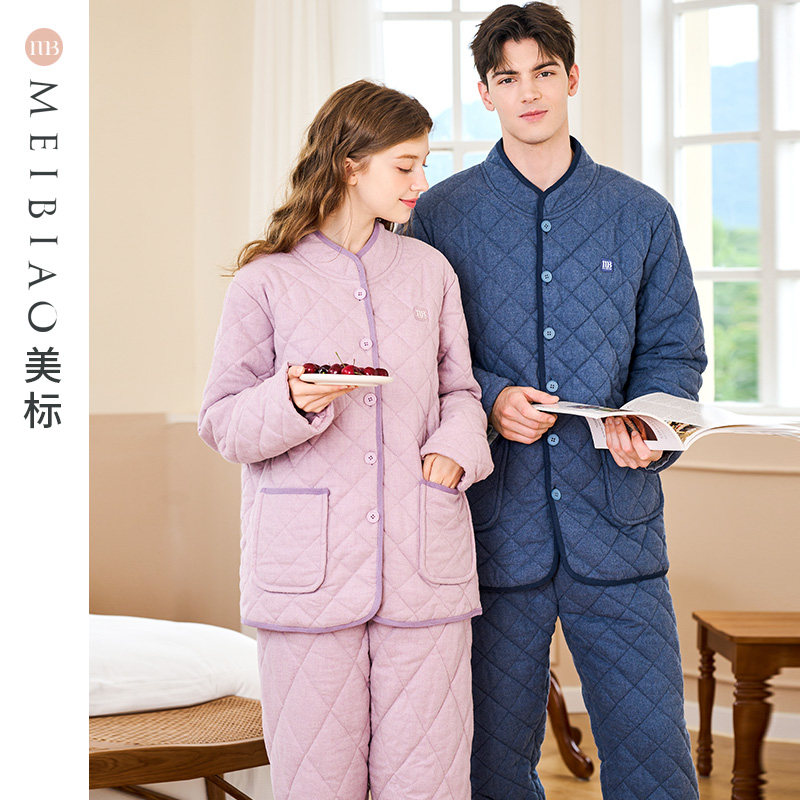 美标新款三层加厚保暖夹棉纯棉睡衣套装女秋冬全棉质时尚家居服男